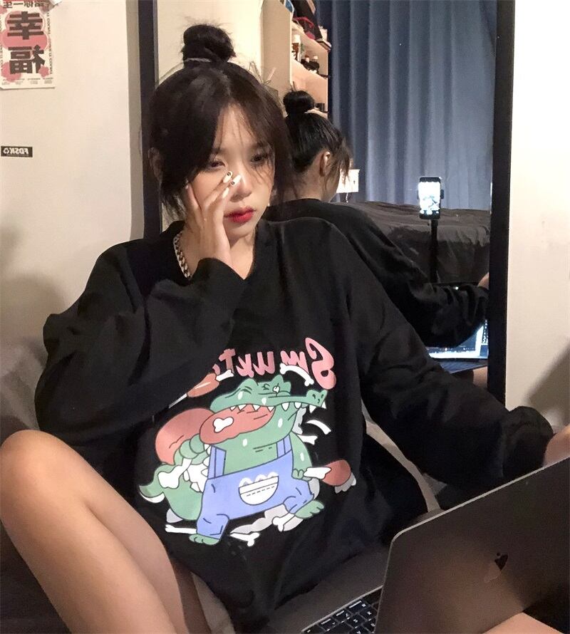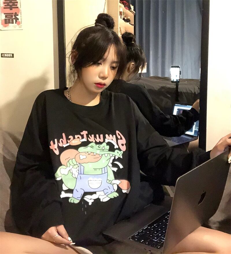 秋物ラウンドネックセーター レディース韓国ファッションNEWスタンダードプリントルーズトップス ロング レトロ オータム Oネック スタイル 長袖 コーデ モノクロ Studio10413531620 | pLegLad Studios
