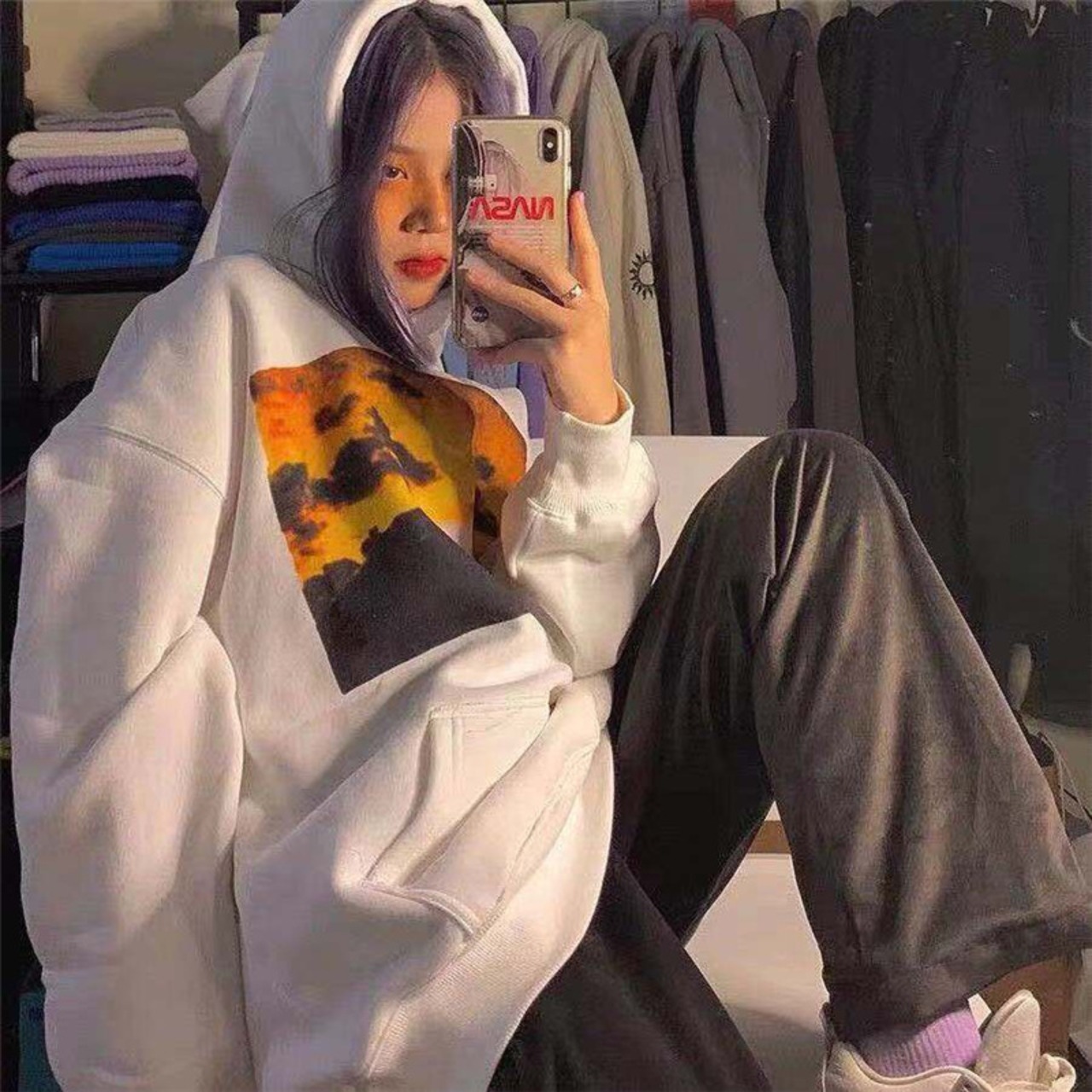 フードセーター 秋物韓国ファッションNEWプリントルーズトップス ロング ストリート オータム ボーイズ スタイル 長袖 コーデ モノクロ Studio36596051406 | pLegLad Studios