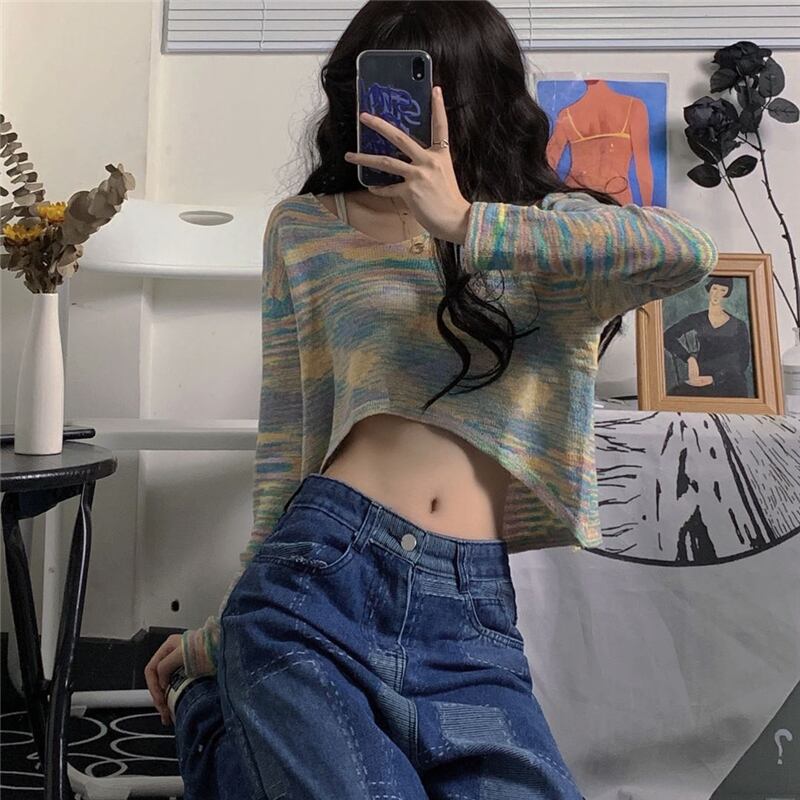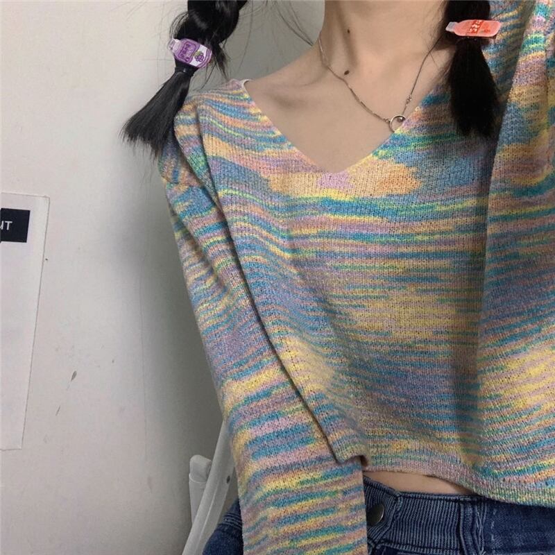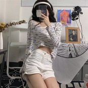 ラウンドネックセーター 秋物韓国ファッションNEWストライプルーズVネック薄手トップス ロング オータム Oネック スタイル 長袖 コーデ モノクロ Studio58635991507 | pLegLad Studios