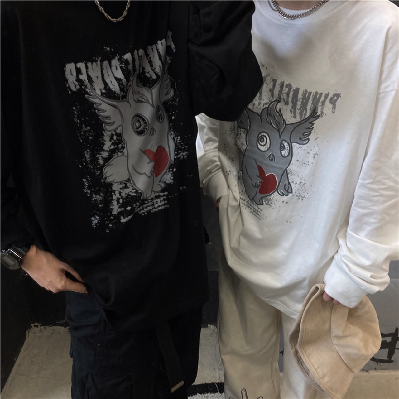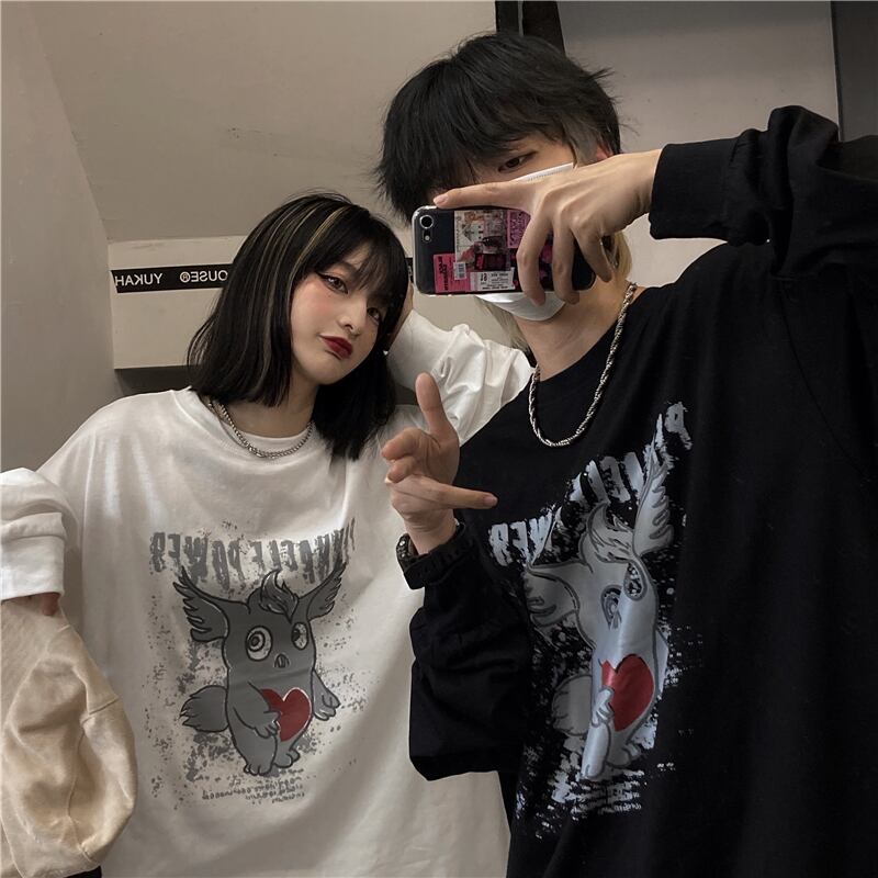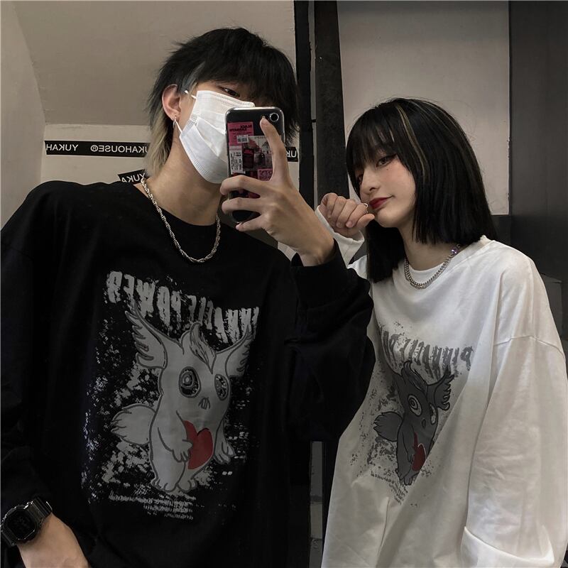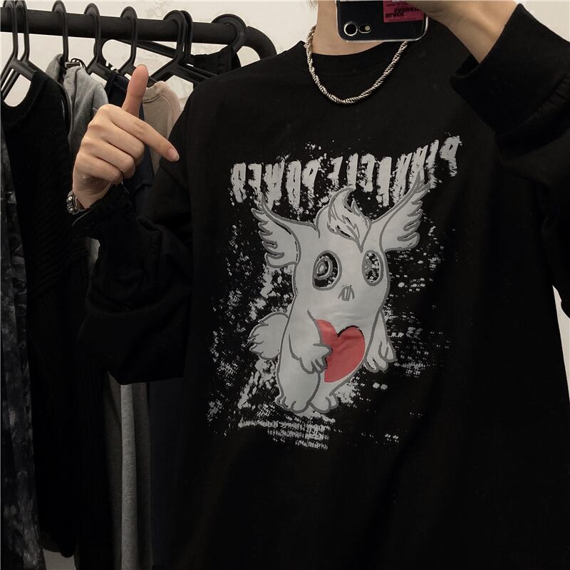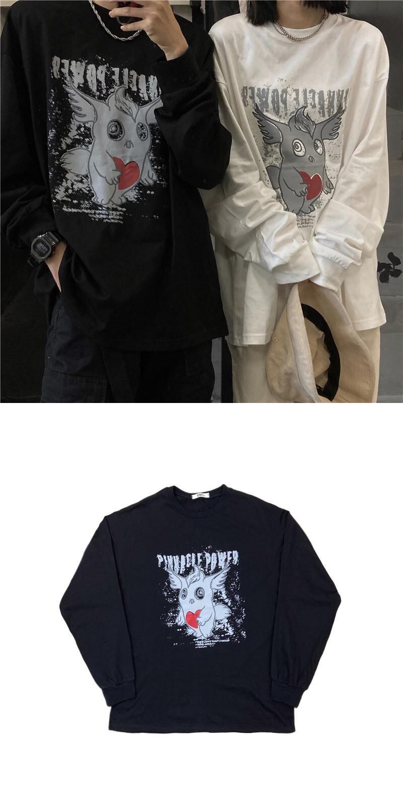 ルーズゆったりシャツ レディース秋物韓国ファッションNEWダークプリントTシャツトップス ロング オータム スタイル 長袖 コーデ モノクロ Studio47562439559 | pLegLad Studios