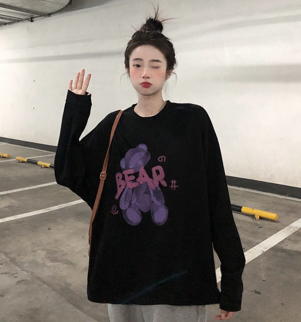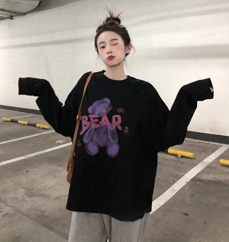 ルーズラウンドネックTシャツレディース秋物韓国ファッションNEWプリントカジュアルトップス ロング 原宿 オータム Oネック スタイル 長袖 コーデ モノクロ Studio43195054257 | pLegLad Studios