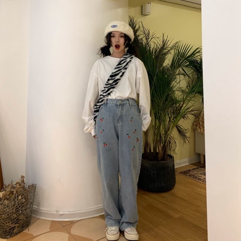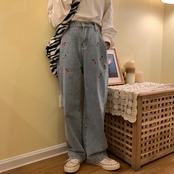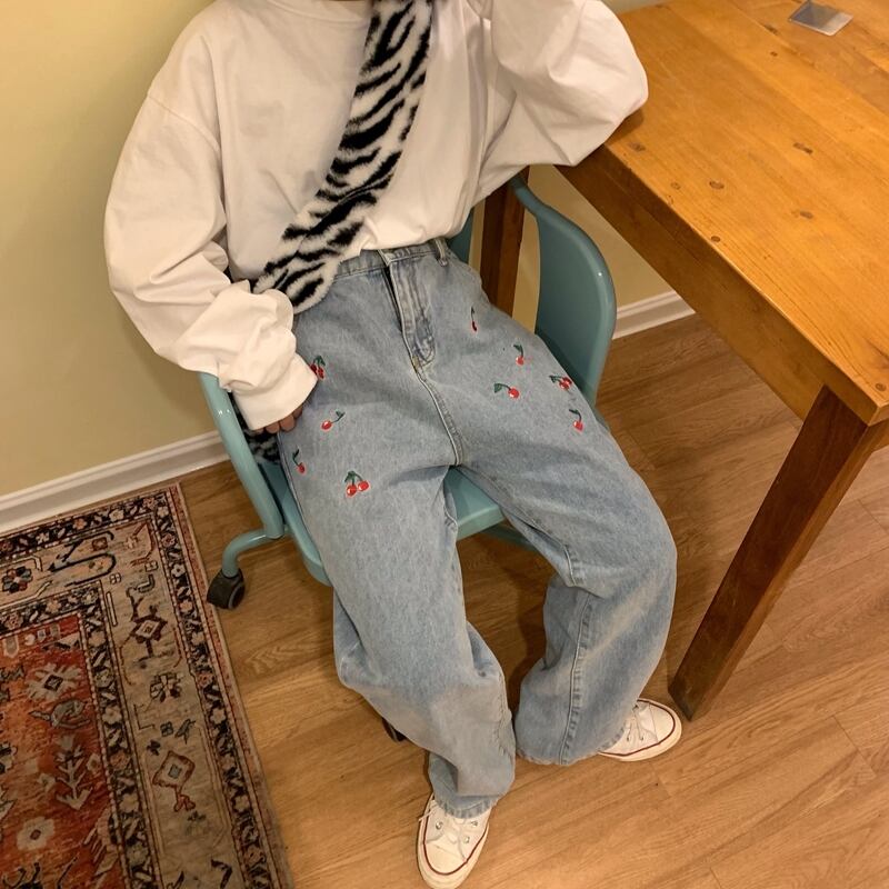 スタンダードジーンズ レディース秋物韓国ファッション刺繍ルーズワイドレッグパンツ ハイウェストウェスト レトロ オータム ワイドパンツ スタイル ウエスト コーデ モノクロ Studio33359702990 | pLegLad Studios