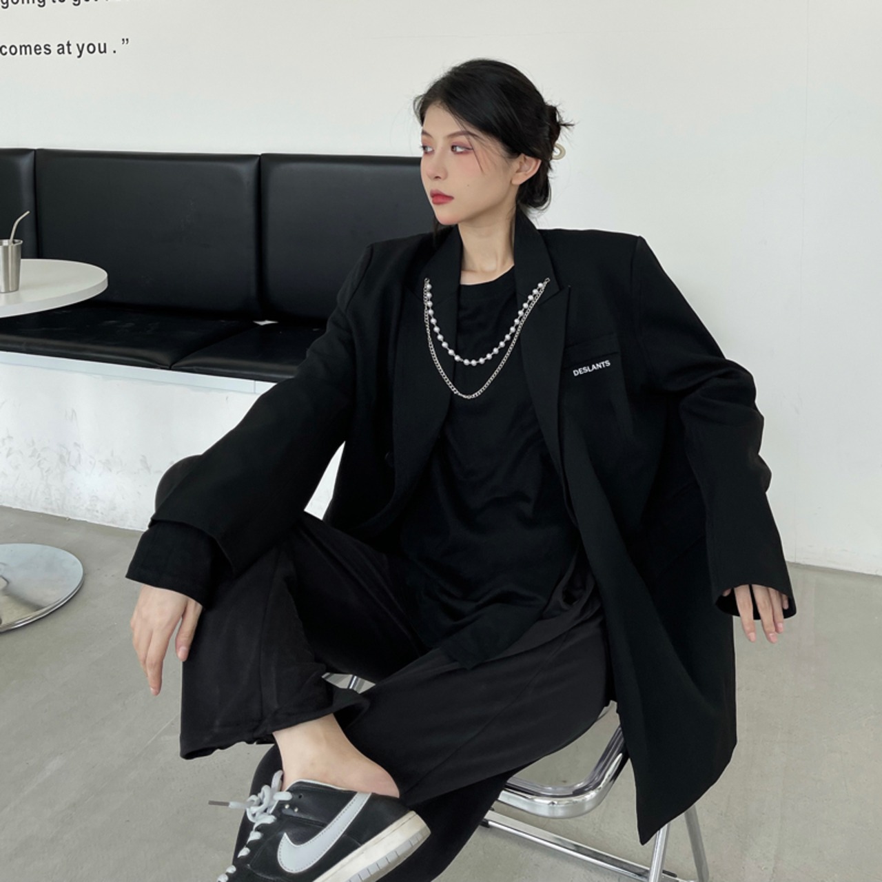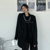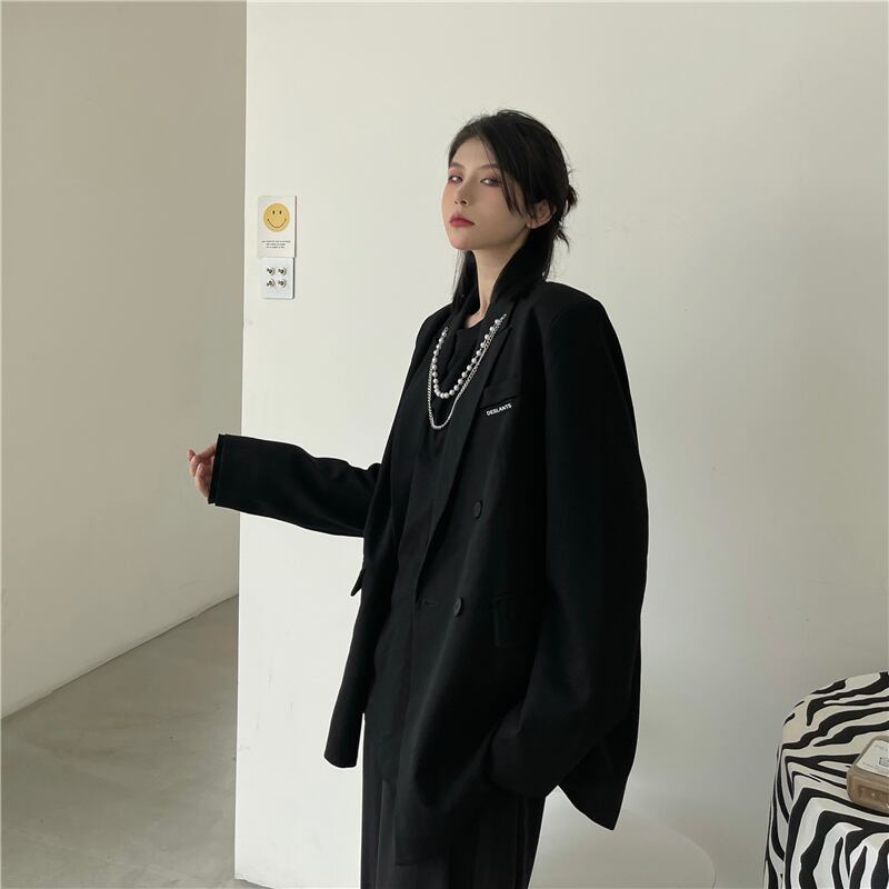 ブラックジャケット レディース秋物韓国ファッションダークルーズチェーン トップス ロング オータム スタイル 長袖 コーデ モノクロ Studio8671667780 | pLegLad Studios