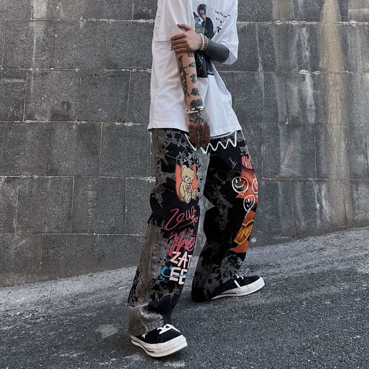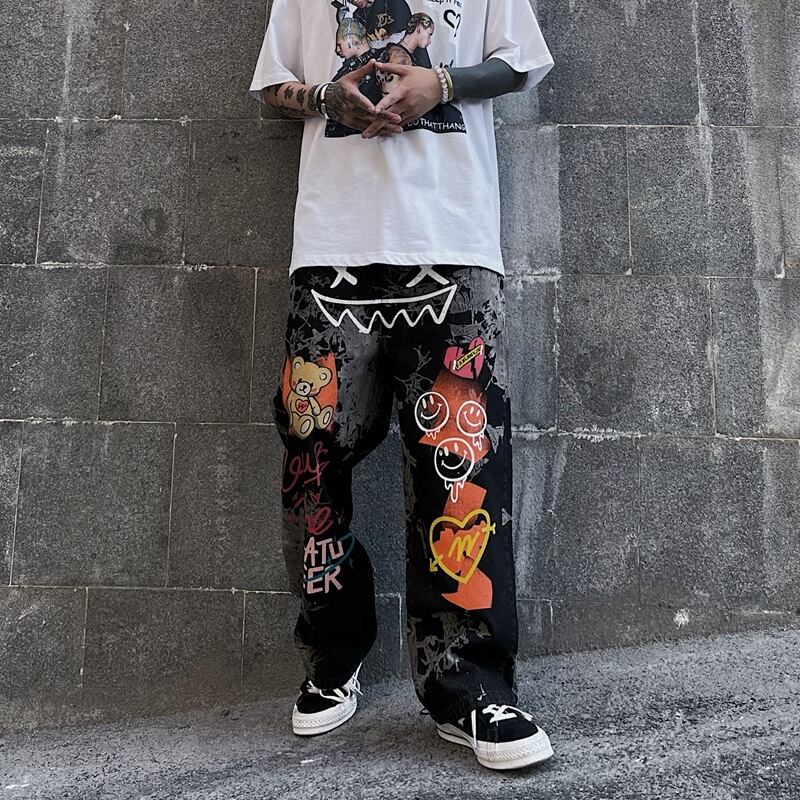 カジュアルジーンズ レディース夏服スタイル韓国ファッションプリントルーズパンツ ワイドレッグ ストリート 夏物 ワイドパンツ コーデ モノクロ Studio6949514032 | pLegLad Studios
