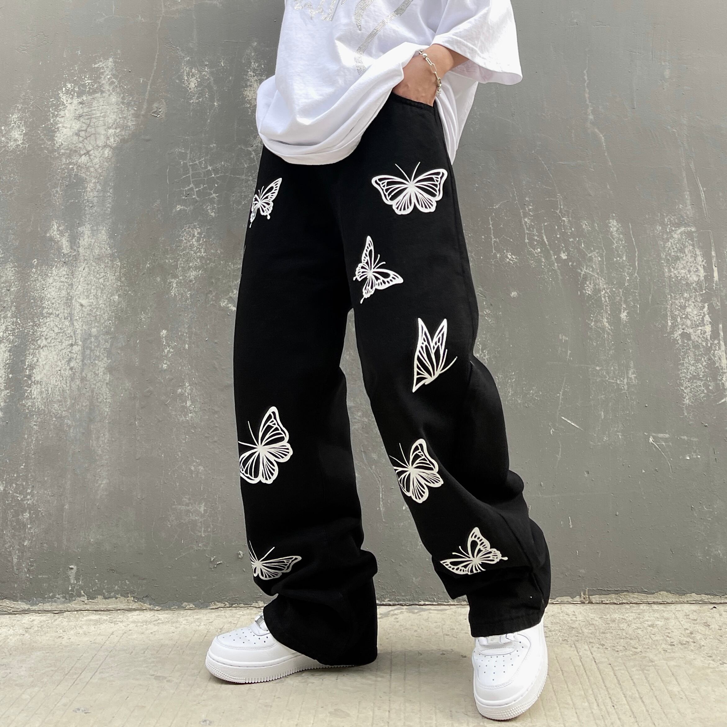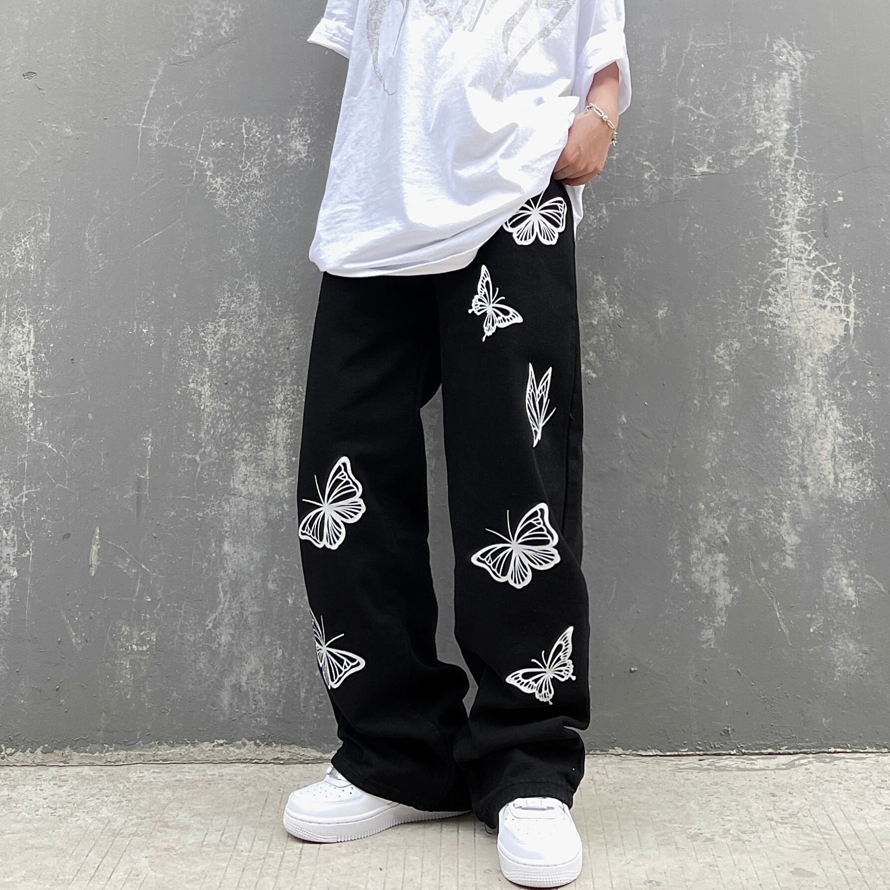 Butterflyデザイン プリント柄ジーンズ 夏服韓国ファッションスタイルルーズワイドレッグパンツ 夏物 ワイドパンツ コーデ モノクロ Studio58161410594 | pLegLad Studios