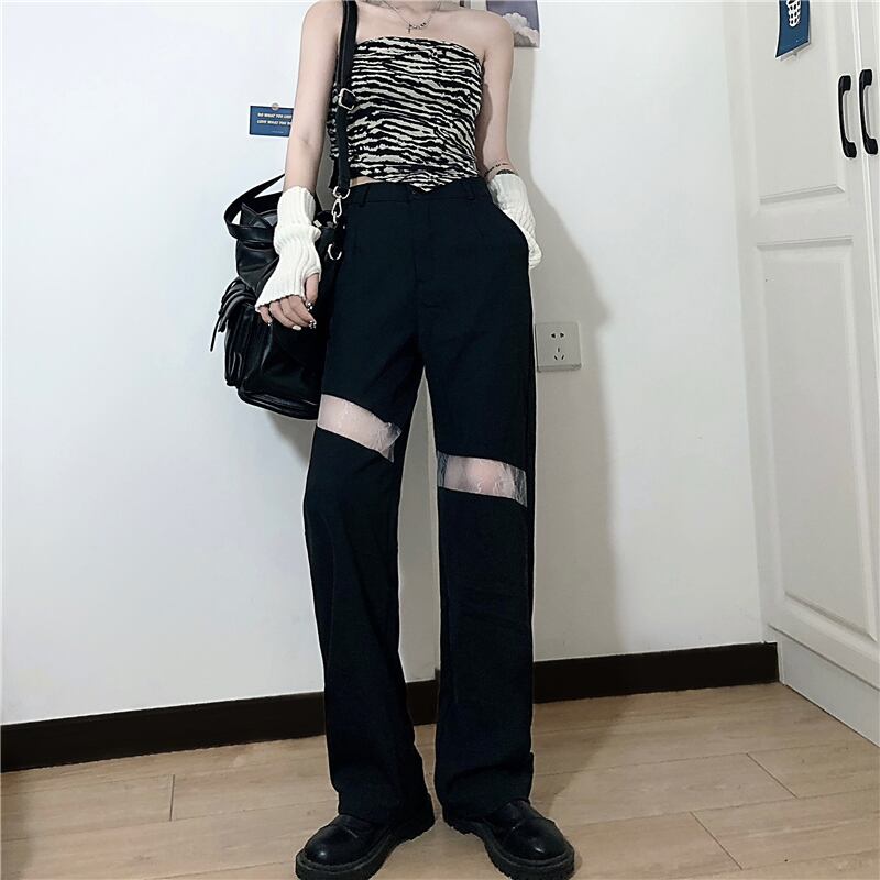 ダークカジュアルパンツ レディース夏服韓国ファッションスタイルルーズワイドレッグハイウェストウェスト 夏物 ワイドパンツ ステッチ ウエスト コーデ モノクロ Studio47763189875 | pLegLad Studios
