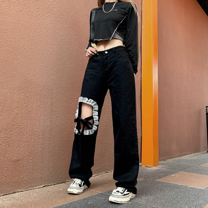 ジーンズ レディース韓国ファッションNEWレースサイド薄手ルーズハイウェストウェストワイドレッグ ストリート ワイドパンツ スタイル ウエスト Studios88945408388 | pLegLad Studios