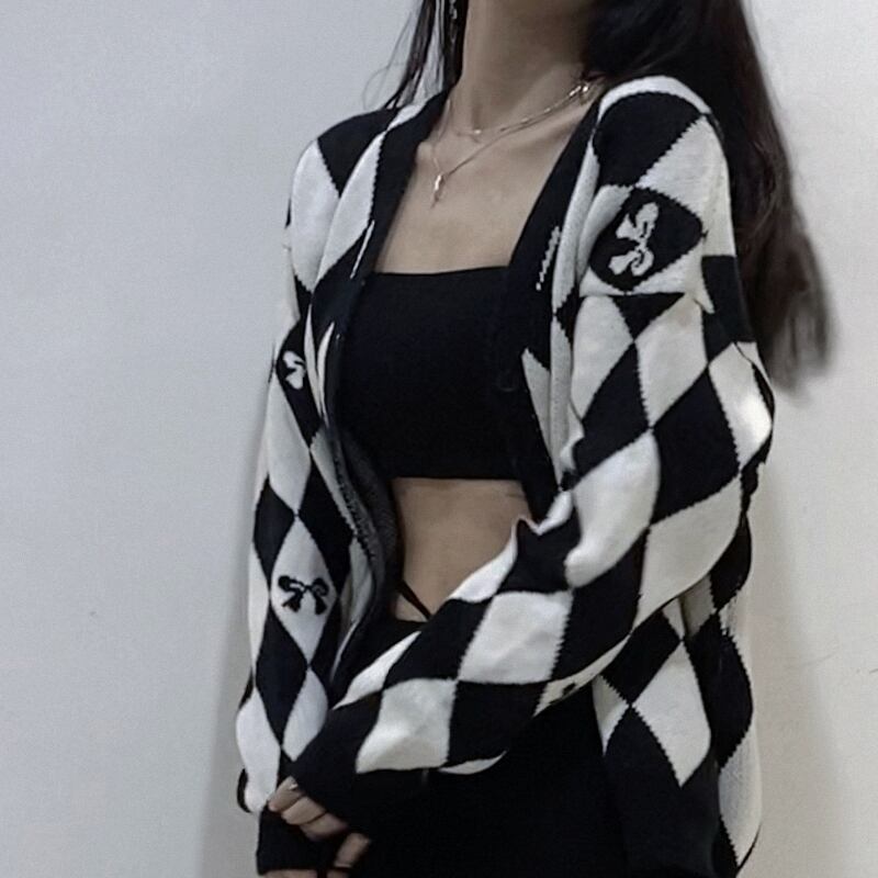 秋物ウィンター韓国ファッションNEWスタンダードジャカードブラックホワイトルーズカーディガンセーター ニットジャケット レディース ロング レトロ オータム 冬物 ピュア スタイル 長袖 Studios35628996808 | pLegLad Studios
