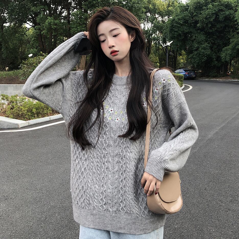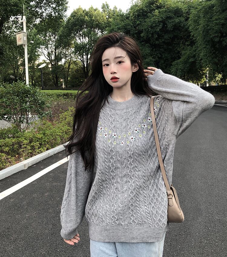 色:ベージュの刺繡セーター,グレー刺繍入りセーター