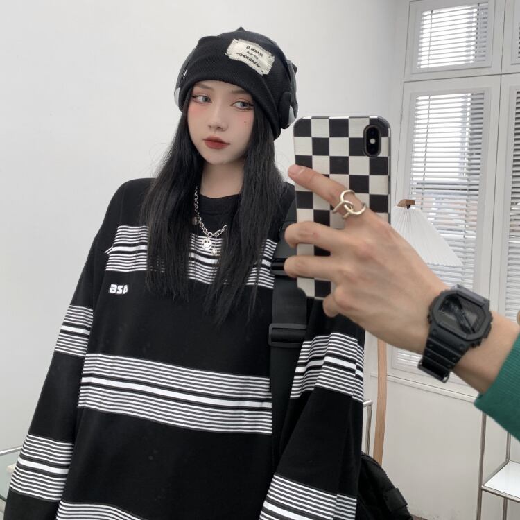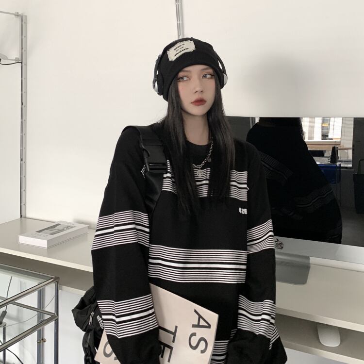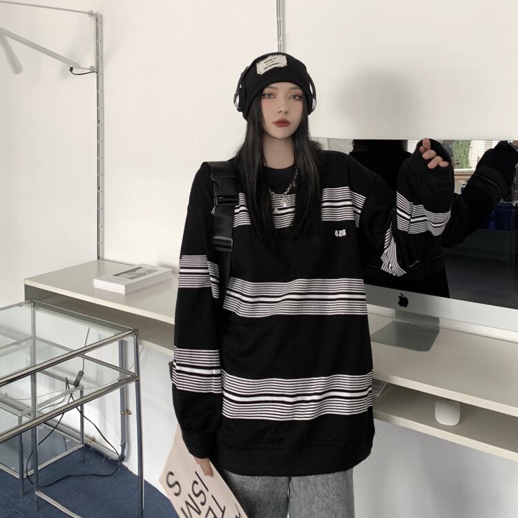 NEWスタンダードストライププリントラウンドネックセーター ルーズTシャツトップス メンズレディース ロング レトロ ストリート Oネック 長袖 Studios71383243164 | pLegLad Studios