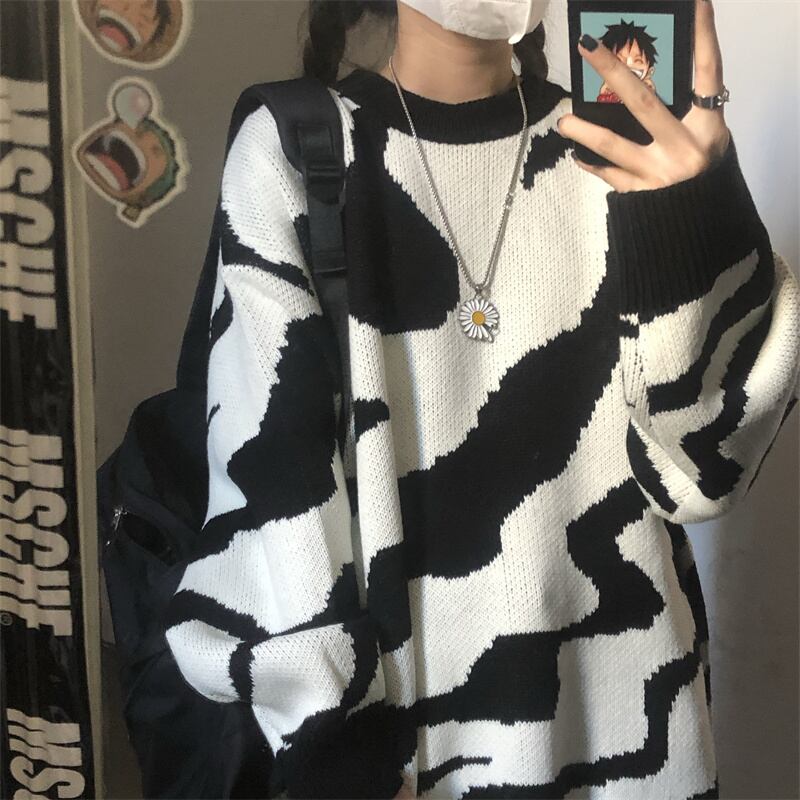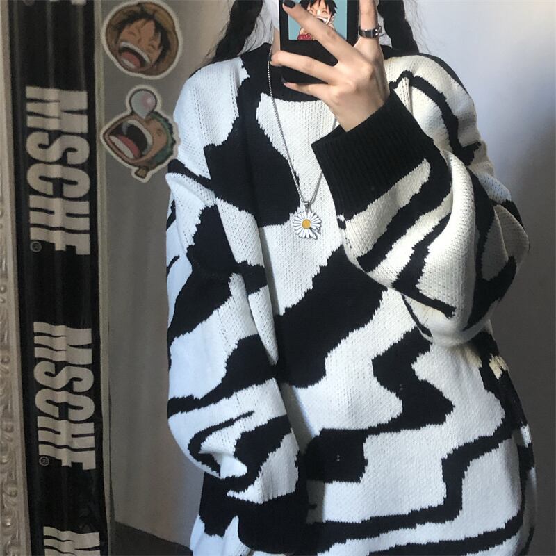 パターンセーター レディース秋物ウィンター韓国ファッションNEWブラックホワイトカラールーズニットトップス オータム 冬物 スタイル Studios9075759642 | pLegLad Studios
