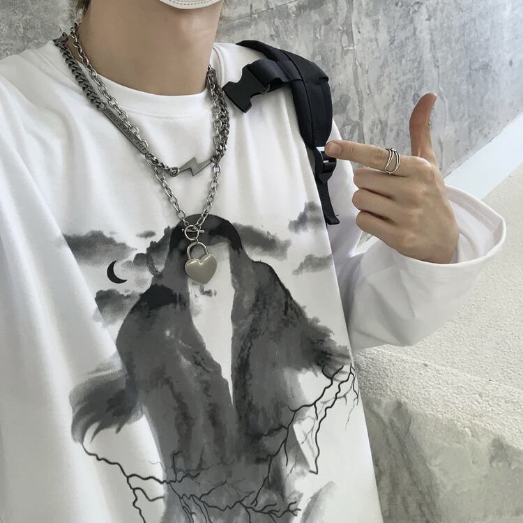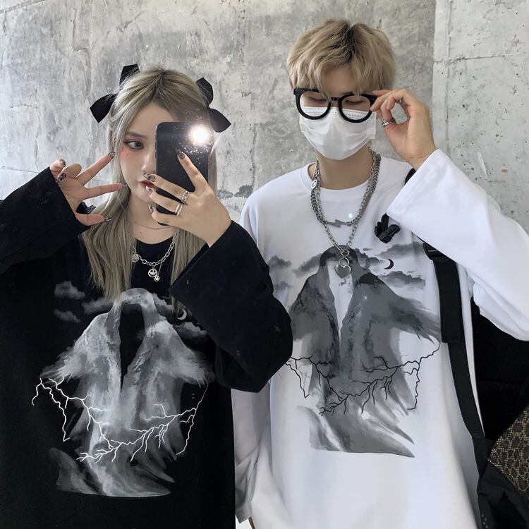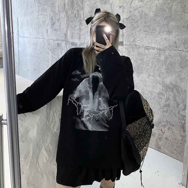 秋物韓国ファッションNEWダークプリントゆったりシャツ ラウンドネックルーズTシャツトップス レディース ロング ストリート オータム Oネック スタイル 長袖 Studios14173027486 | pLegLad Studios