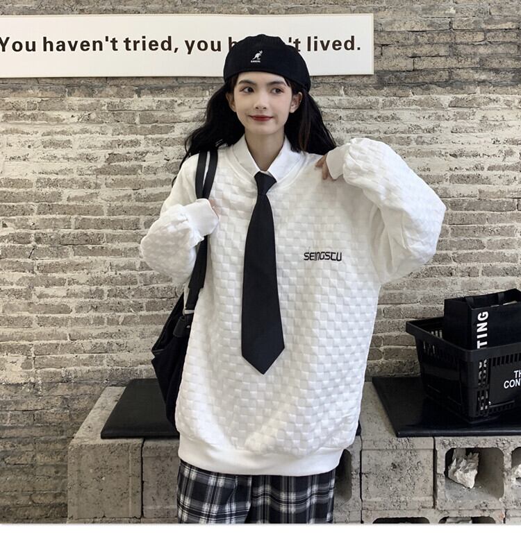 ホワイトラウンドネックプルオーバー セーター レディース秋物韓国ファッションNEW刺繍ルーズトップス オータム Oネック コーデ モノクロ Studio21699847806 | pLegLad Studios