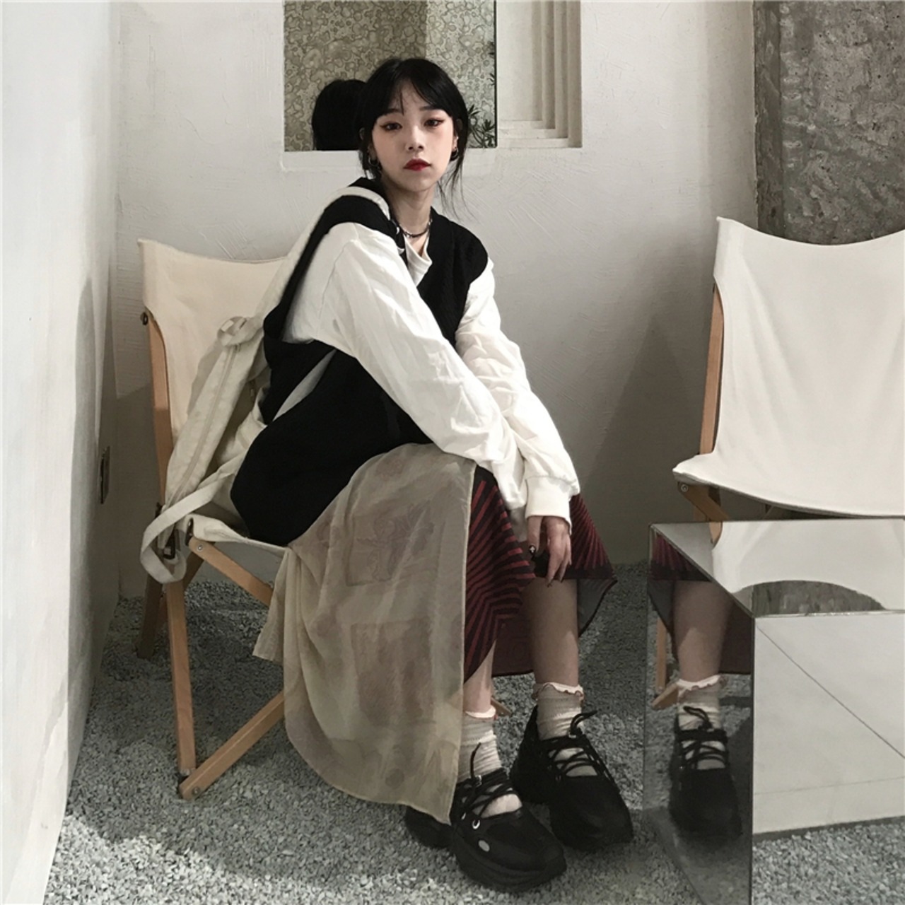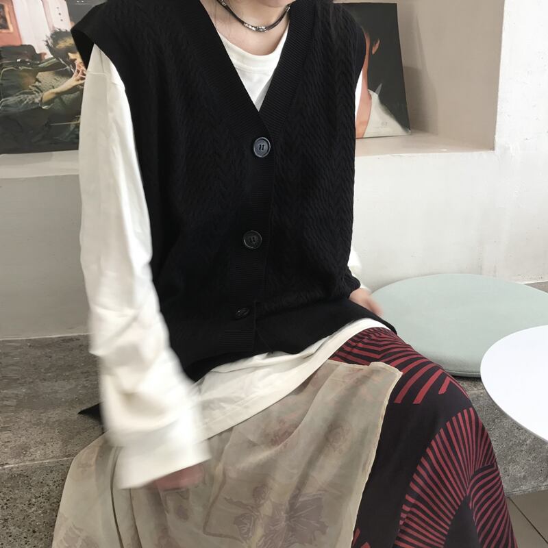 Vネックボタンカーディガンノースリーブセーター レディース秋物韓国ファッションスタンダードスタイルルーズ レトロ オータム コーデ モノクロ Studio9002809838 | pLegLad Studios