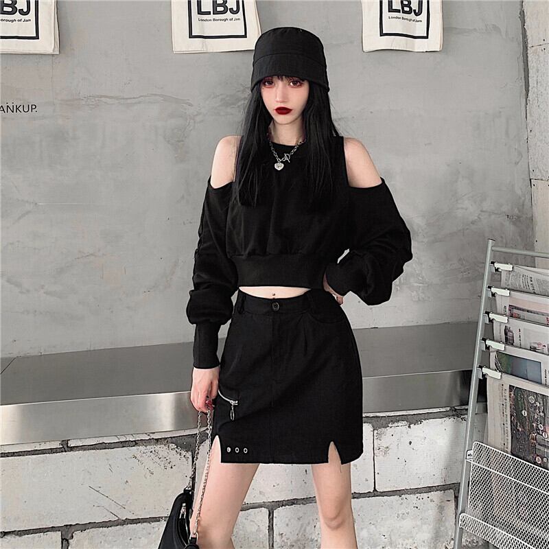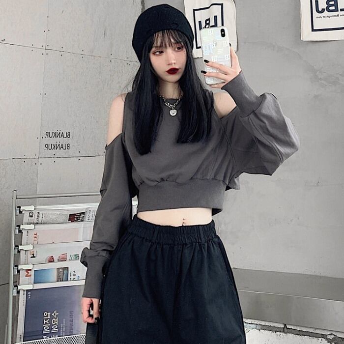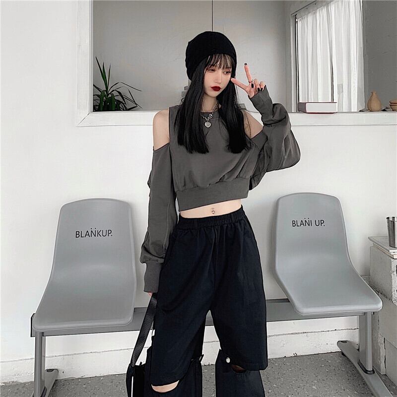 秋物韓国ファッションNEWスタイルショートトップス カジュアルルーズラウンドネックセーター ロング 原宿 オータム Oネック オフショルダー 長袖 Studios73574914112 | pLegLad Studios