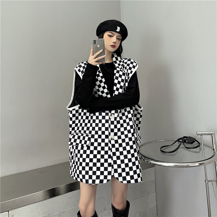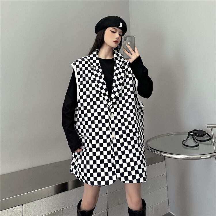 ブラックホワイト格子柄ノースリーブレディース秋物韓国ファッションスタイルジャケット オータム ウエスト ミドル丈 コーデ モノクロ Studio25511302808 | pLegLad Studios