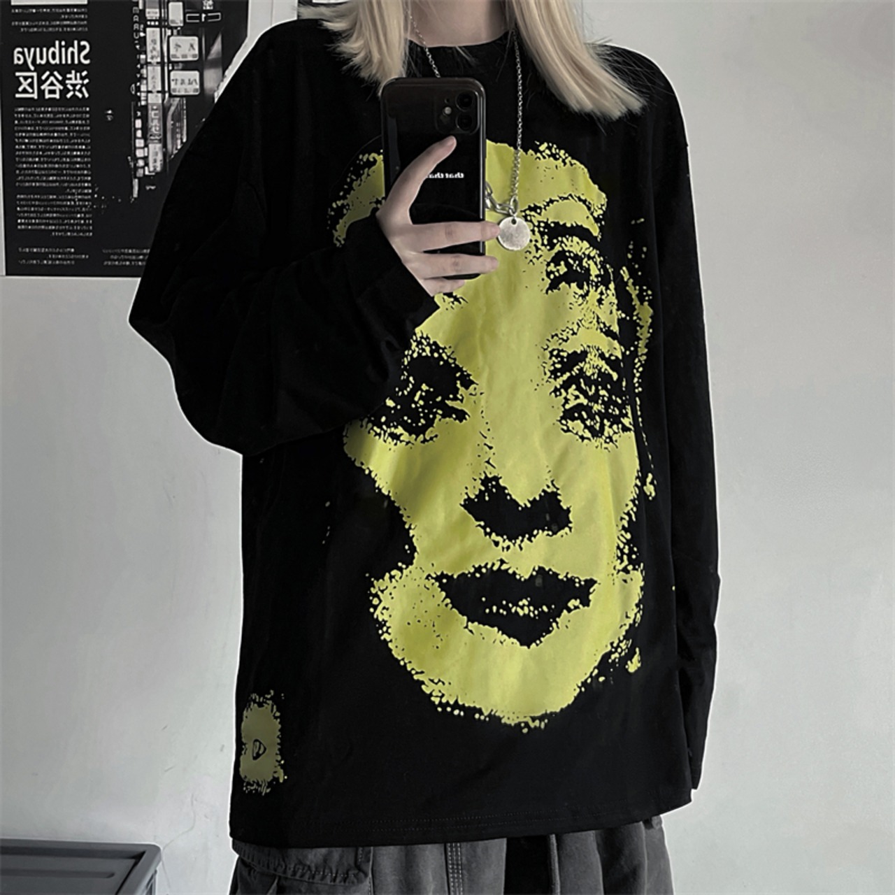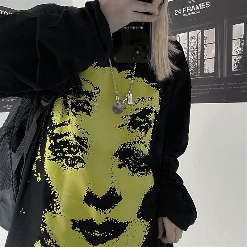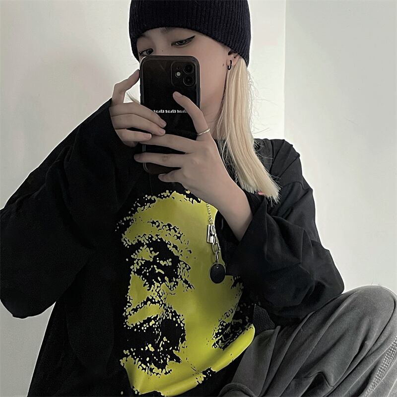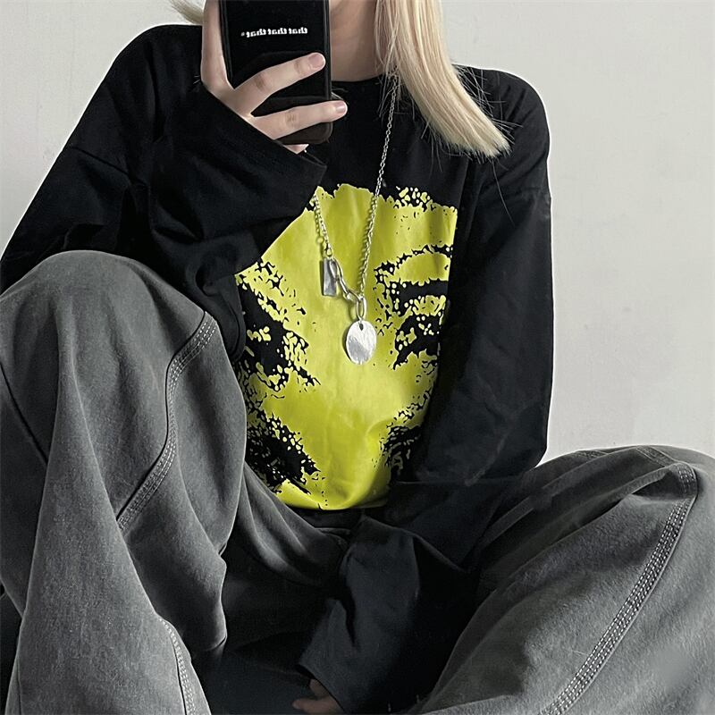 秋物ウィンター韓国ファッションNEWスタイルダークブラックプリントカジュアルルーズラウンドネックゆったりTシャツレディース ロング 原宿 オータム 冬物 Oネック 長袖 Studios83005374099 | pLegLad Studios