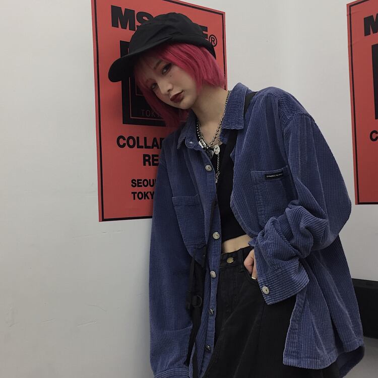 秋物韓国ファッションNEWスタイルスタンダードブルーコーデュロイジャケット ルーズカジュアルシャツ トップス レディース ロング レトロ オータム 長袖 Studios7833250107 | pLegLad Studios