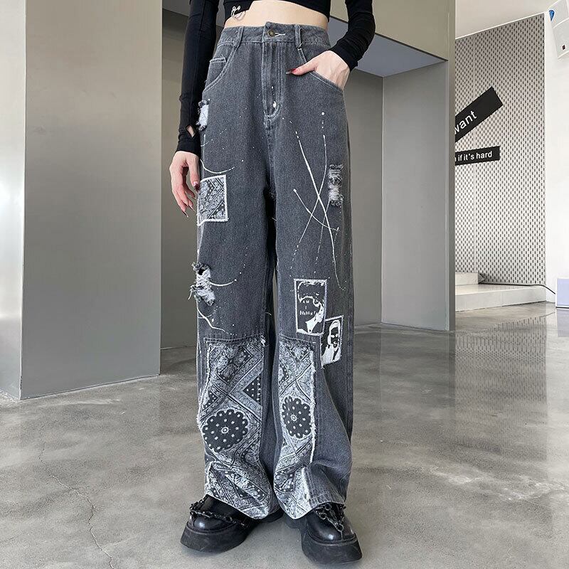 ウェストジーンズ レディース韓国ファッションNEWFlowerデザイン ルーズ薄手パンツ ストリート フラワーデザイン ステッチ スタイル ウエスト Studios70488342702 | pLegLad Studios