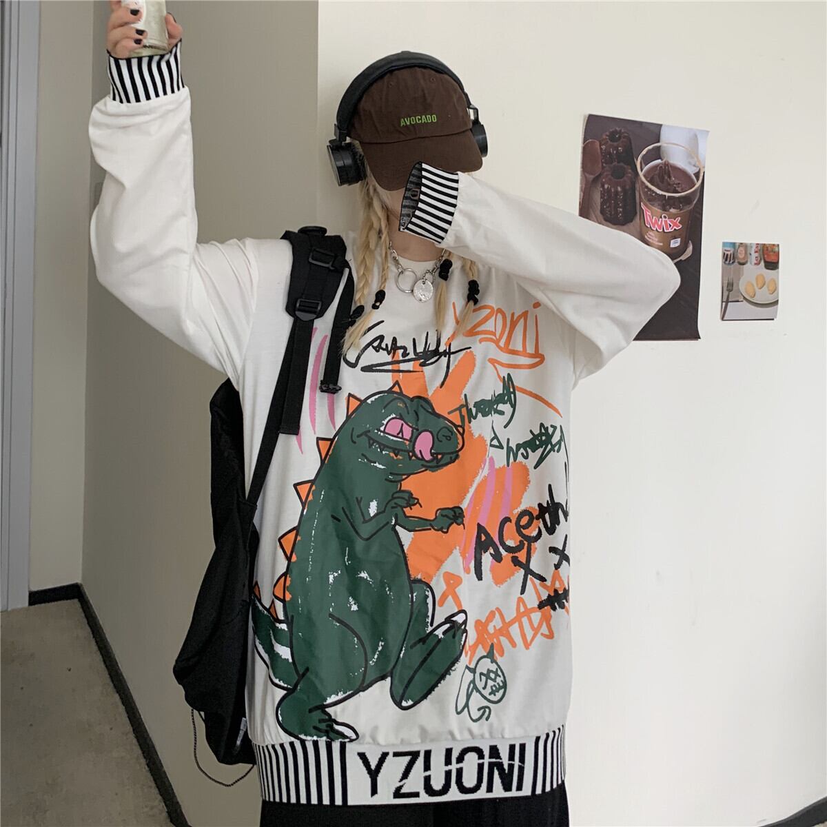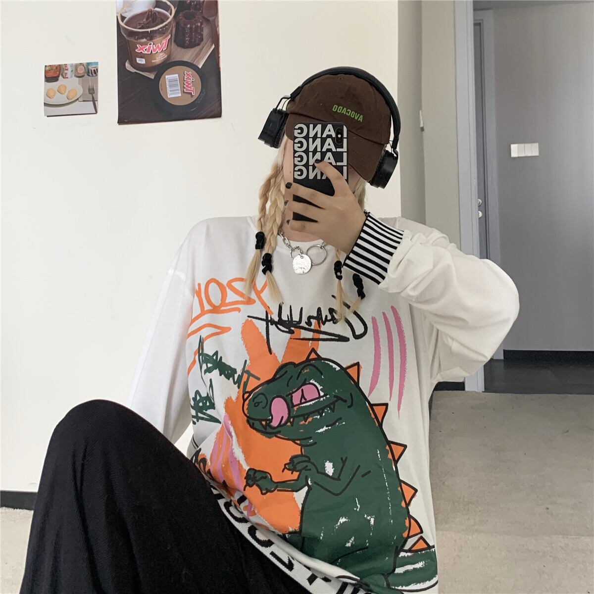 ゆったりシャツ トップス レディース秋物韓国ファッションNEWスタイルスタンダードプリントカジュアルルーズTシャツ ロング レトロ 原宿 オータム 長袖 Studios10699036781 | pLegLad Studios