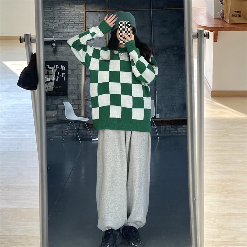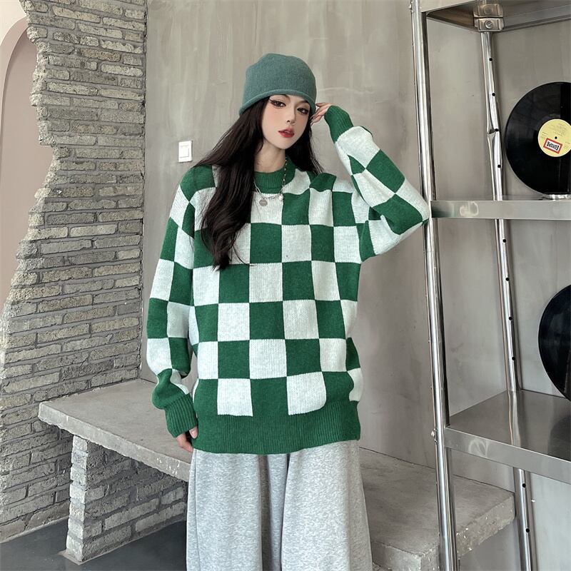秋物ウィンター韓国ファッションNEWスタイルスタンダード格子柄プルオーバー セーター ルーズニットトップス レディース ロング レトロ オータム 冬物 長袖 Studios38953899843 | pLegLad Studios