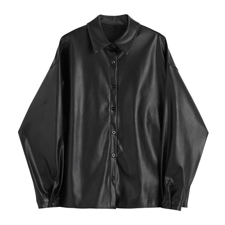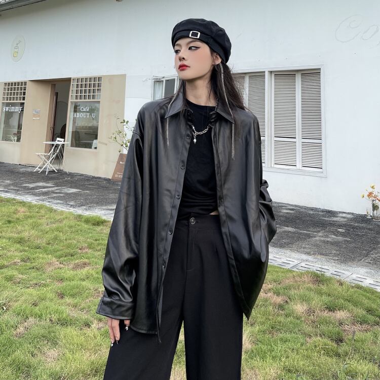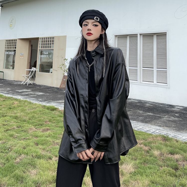 スタイルシャツ レディース韓国ファッションNEWスタンダードブラックルーズレザージャケット トップス ロング レトロ ストリート 長袖 ミドル丈 Studios55583686860 | pLegLad Studios