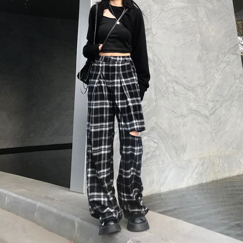 格子柄カジュアルパンツ 韓国ファッションNEWスタイルスタンダードルーズ薄手ハイウェストウェストワイドレッグ レトロ ワイドパンツ ウエスト Studios98922738625 | pLegLad Studios