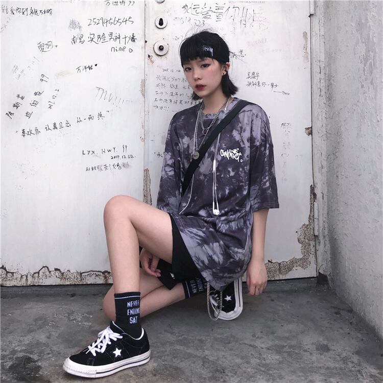 夏服韓国ファッションNEWスタイルダークブラックスタンダードプリント柄ルーズラウンドネックTシャツメンズレディース レトロ 原宿 夏物 Oネック Studios3213243436 | pLegLad Studios