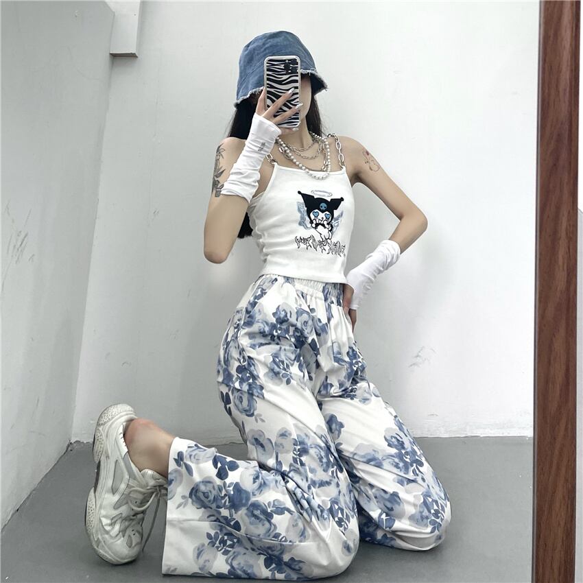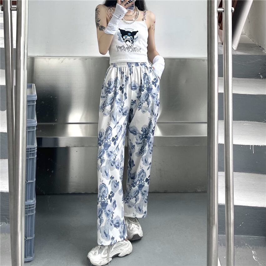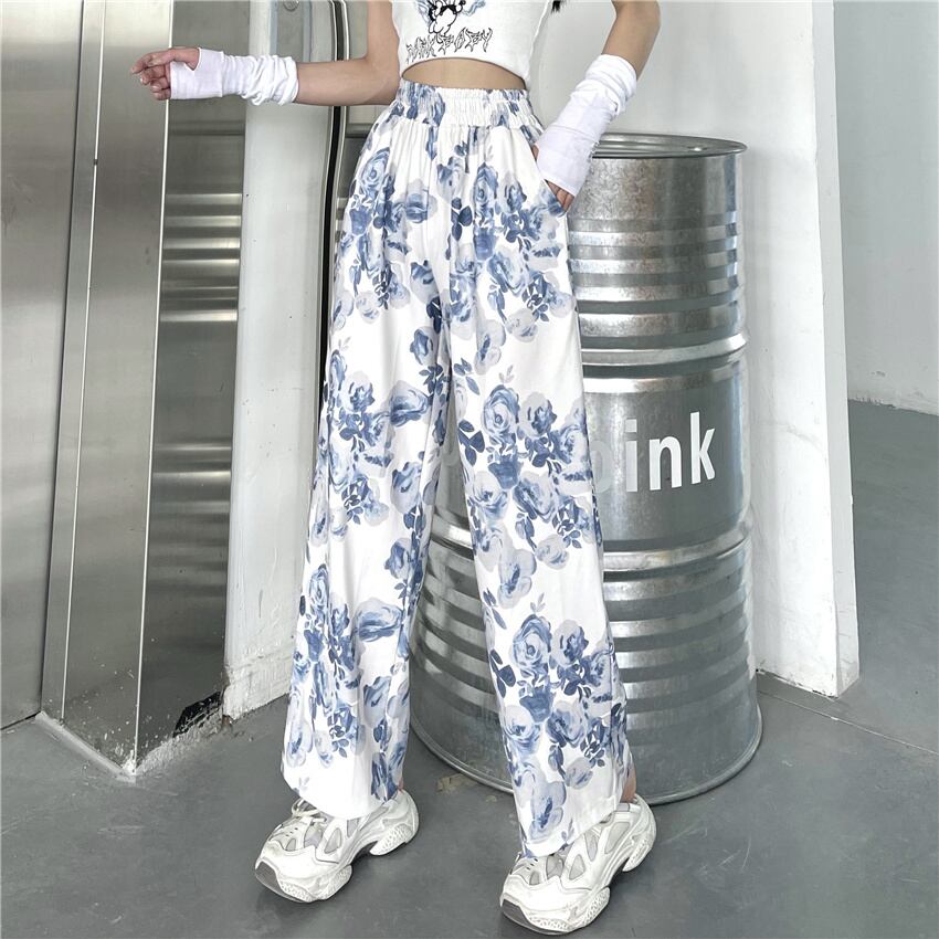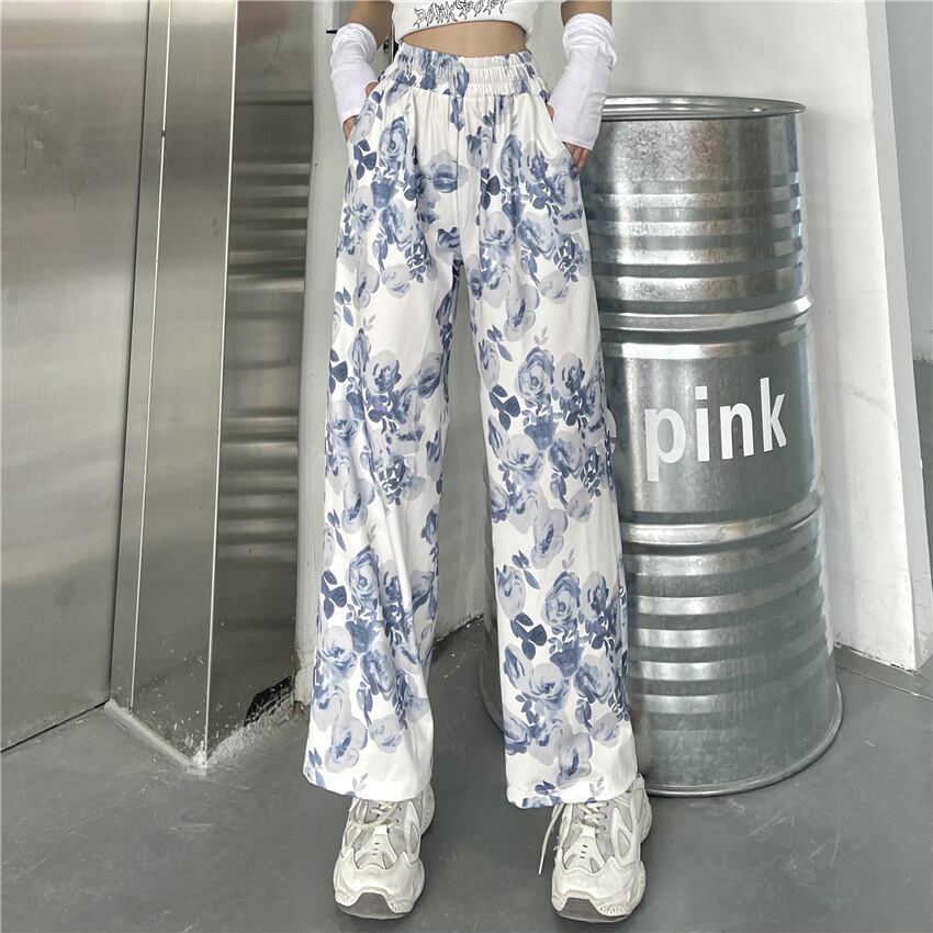 韓国ファッションNEWスタイルスタンダードプリントハイウェストウェスト薄手ルーズワイドレッグカジュアルパンツ レディース レトロ 原宿 ワイドパンツ ウエスト Studios37739240816 | pLegLad Studios
