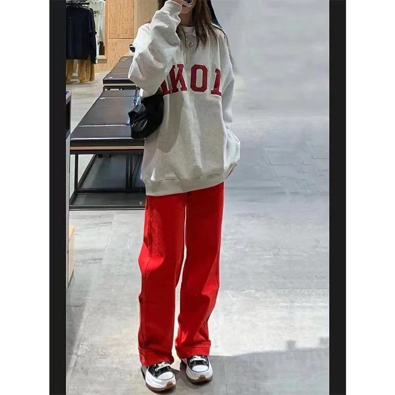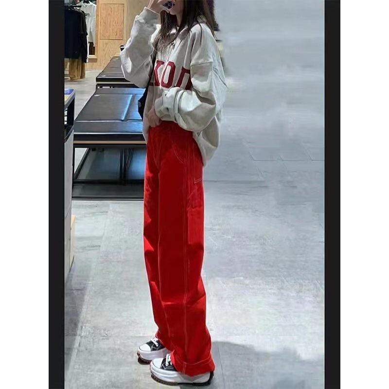 スプリング夏服韓国ファッションNEWレッドカジュアルワイドレッグパンツ ハイウェストウェストスリム 春物 夏物 ワイドパンツ スタイル ウエスト コーデ モノクロ Studio77671573954 | pLegLad Studios