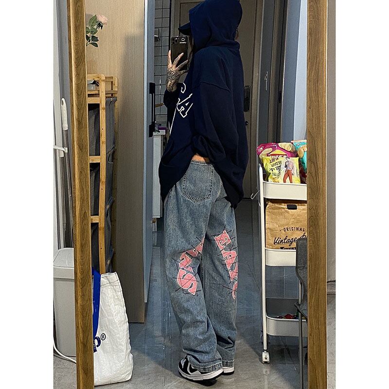 ジーンズ スプリング韓国ファッションNEWルーズワイドレッグパンツ ハイウェストウェストカジュアル レッド 刺繍 春物 ワイドパンツ スタイル ウエスト コーデ モノクロ Studio18682587519 | pLegLad Studios