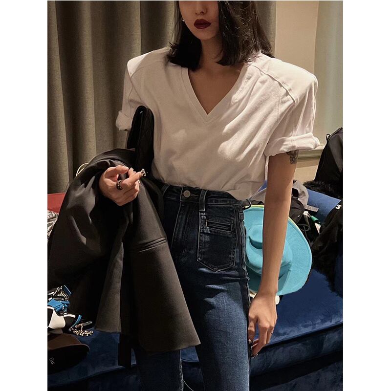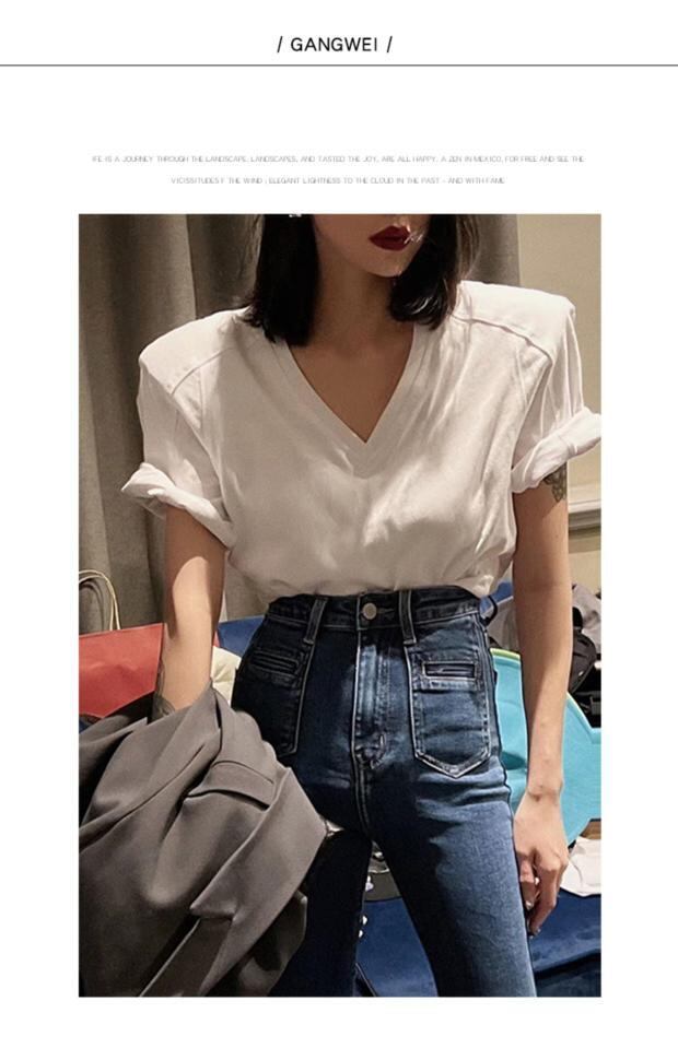 VネックTシャツ夏服ルーズ韓国ファッションスプリングソリッド カラートップス 春物 夏物 ソリッドカラー ステッチ スタイル コーデ モノクロ Studio87918427970 | pLegLad Studios
