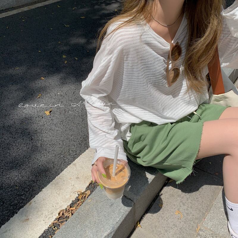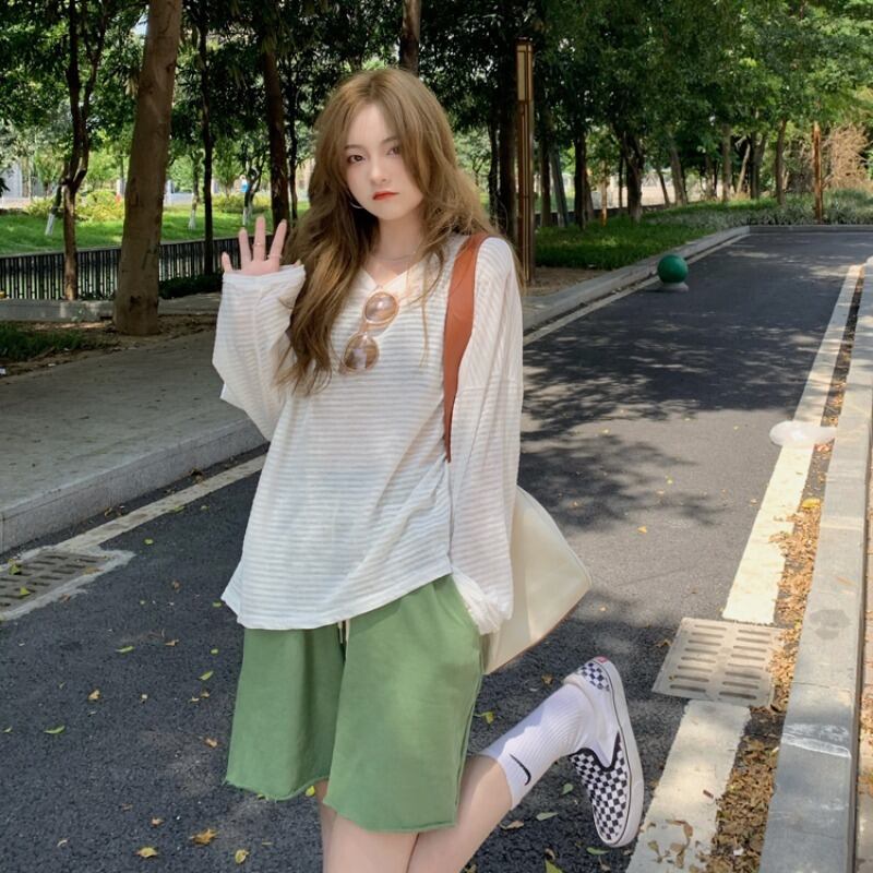 色:ストライプT,グリーンショートパンツ