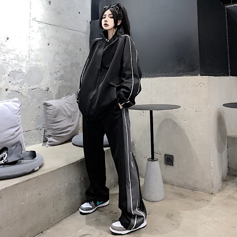 レディース秋物韓国ファッションNEWスタンダードルーズジッパージャケット ワイドレッグパンツ セット レトロ オータム ワイドパンツ スタイル Studios19924843302 | pLegLad Studios