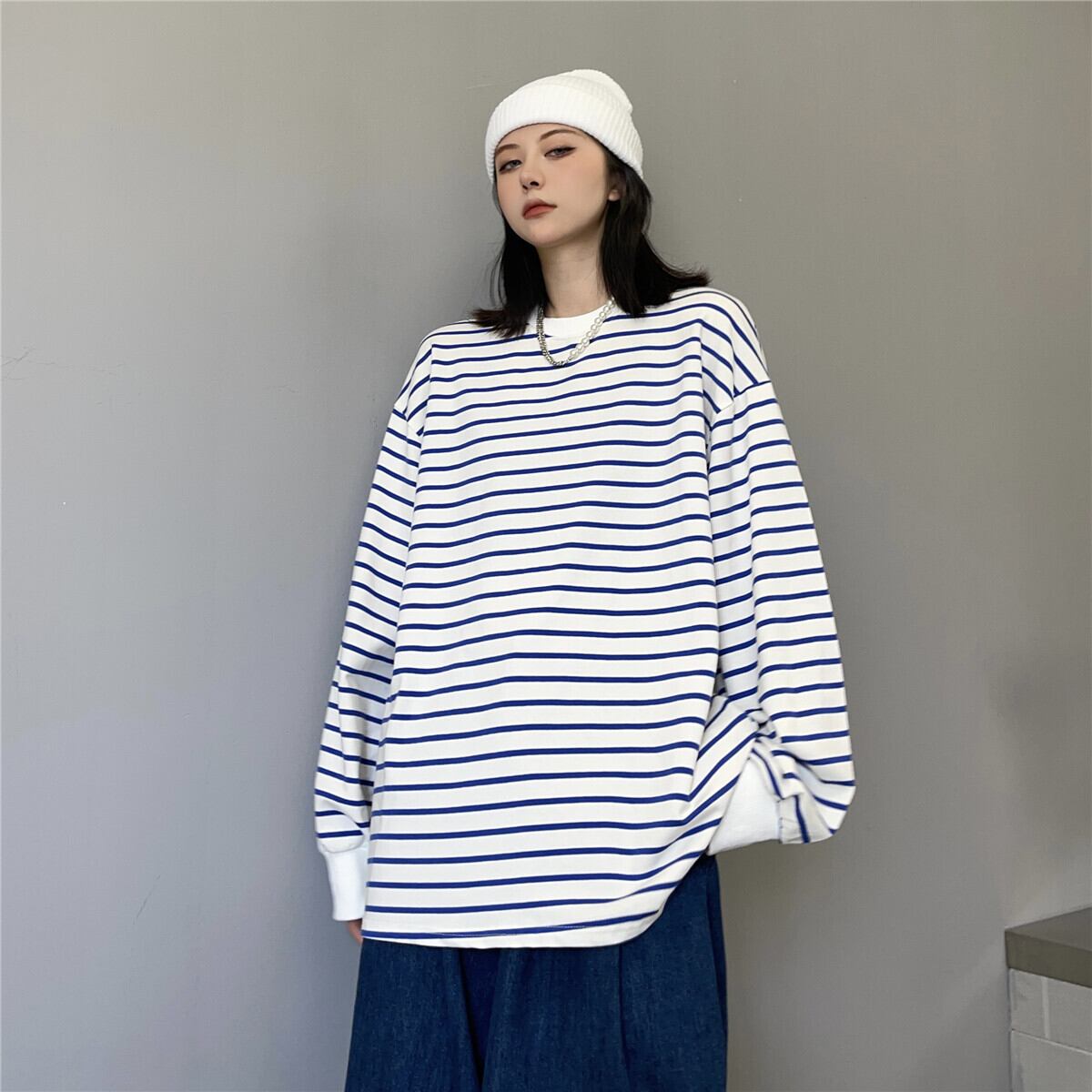スプリング韓国ファッションNEWスタンダードストライププルオーバー ラウンドネックセーター ルーズ薄手ゆったりシャツ トップス レディース ロング レトロ 春物 Oネック スタイル 長袖 Studios53403329634 | pLegLad Studios