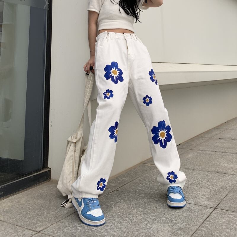 NEWスタンダードFlowerデザイン プリント柄ルーズ薄手ホワイトジーンズ メンズレディース レトロ ストリート フラワーデザイン Studios65331424840 | pLegLad Studios