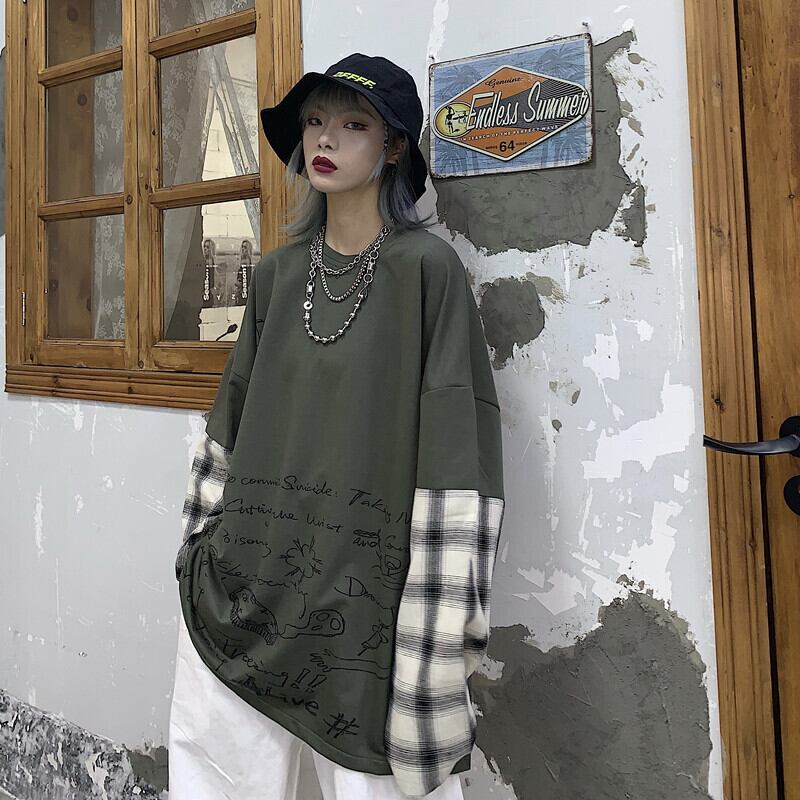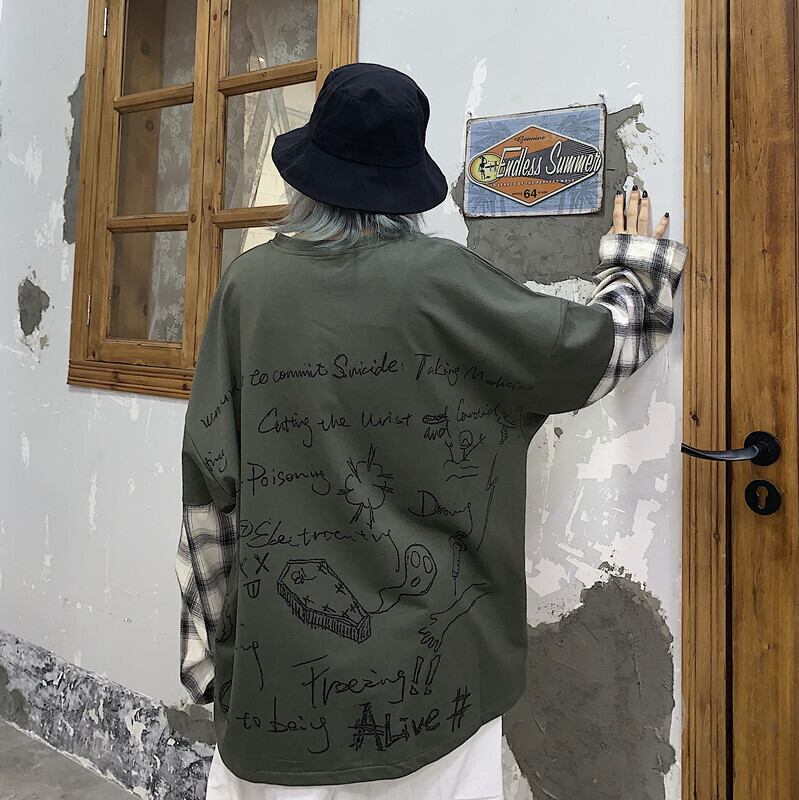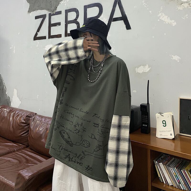 スプリング韓国ファッションNEWスタイルスタンダードルーズプリント柄格子柄Tシャツメンズレディース ロング レトロ 原宿 春物 ステッチ 長袖 Studios66083144543 | pLegLad Studios