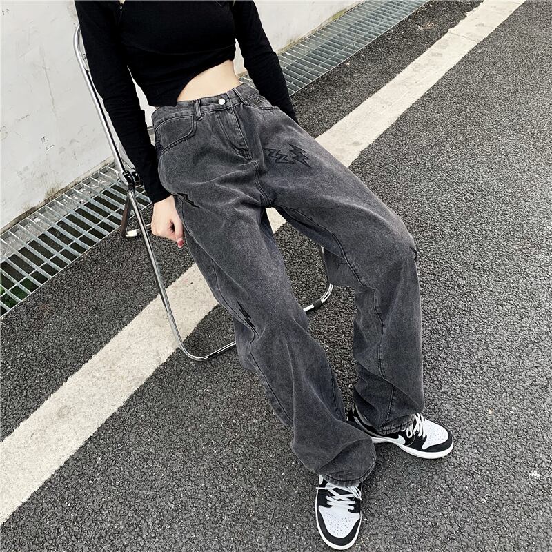ジーンズ レディース韓国ファッションNEWスタンダードブラックグレー刺繍薄手ハイウェストウェストワイドレッグカジュアルパンツ レトロ ワイドパンツ スタイル ウエスト Studios40536613021 | pLegLad Studios