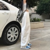 韓国ファッションNEWスタンダードルーズホワイトストレッチウェストハイウェストカジュアルパンツ レトロ エラスティック 伸縮 スタイル ウエスト Studios55884171973 | pLegLad Studios
