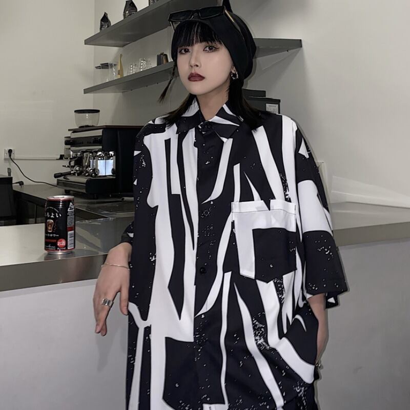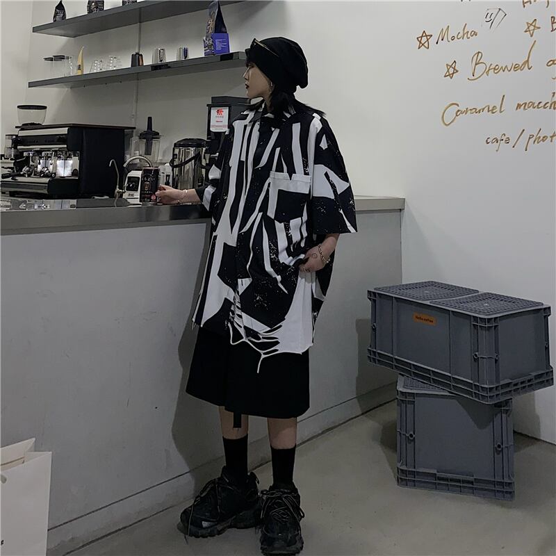 夏服韓国ファッションNEWスタイルダークブラックFlowerデザイン カラープリントルーズシャツ メンズレディース ストリート 原宿 夏物 フラワーデザイン Studios10487358309 | pLegLad Studios