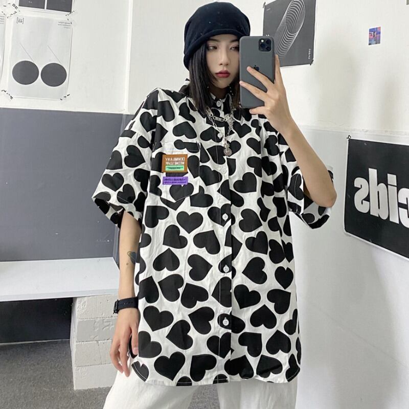夏服韓国ファッションNEWスタンダードハートプリント柄カジュアルルーズシャツ レトロ ストリート 大人ガーリー スウィート キュート 夏物 スタイル Studios26783720439 | pLegLad Studios
