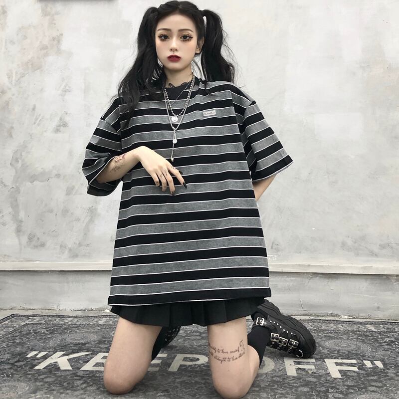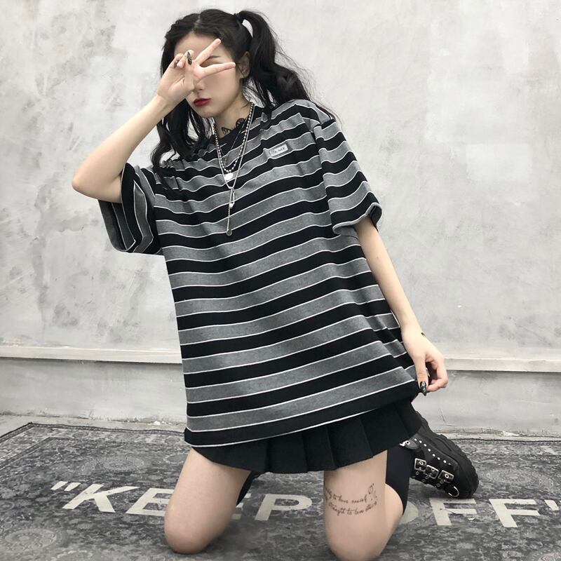 夏服韓国ファッションNEWスタイルスタンダードブラックグレーカラーストライプルーズ薄手ラウンドネックTシャツ レトロ ストリート 原宿 夏物 Oネック Studios23294409954 | pLegLad Studios