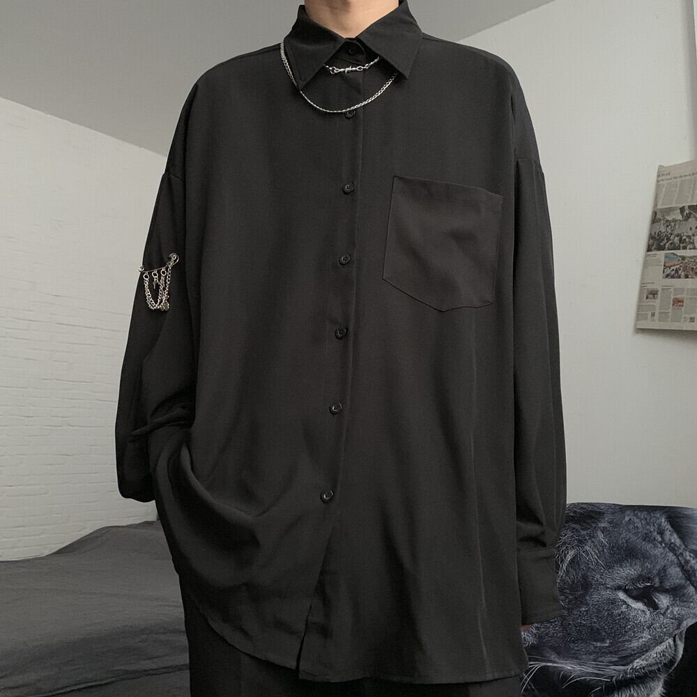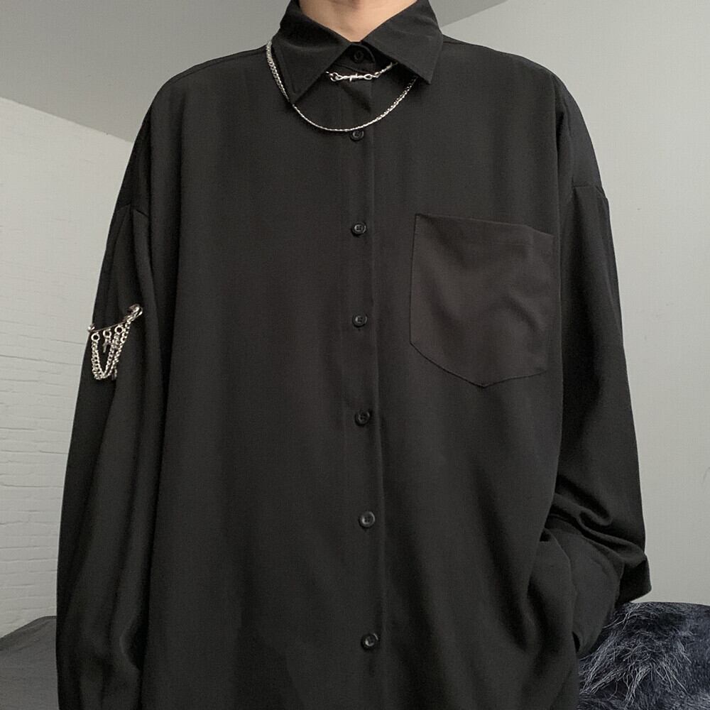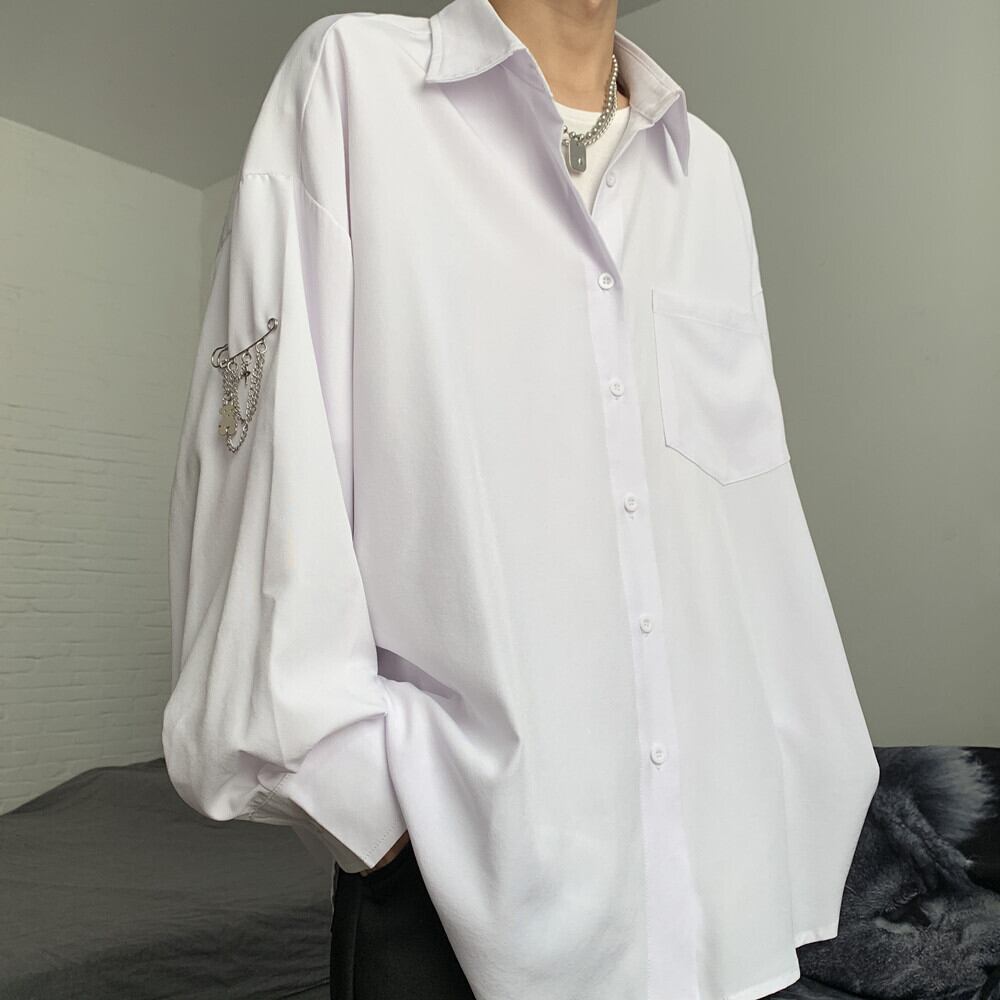 スプリング韓国ファッションNEWメタルチェーン スタンダードルーズシャツ メンズレディース ロング レトロ ストリート 春物 スタイル 長袖 Studios45494896108 | pLegLad Studios