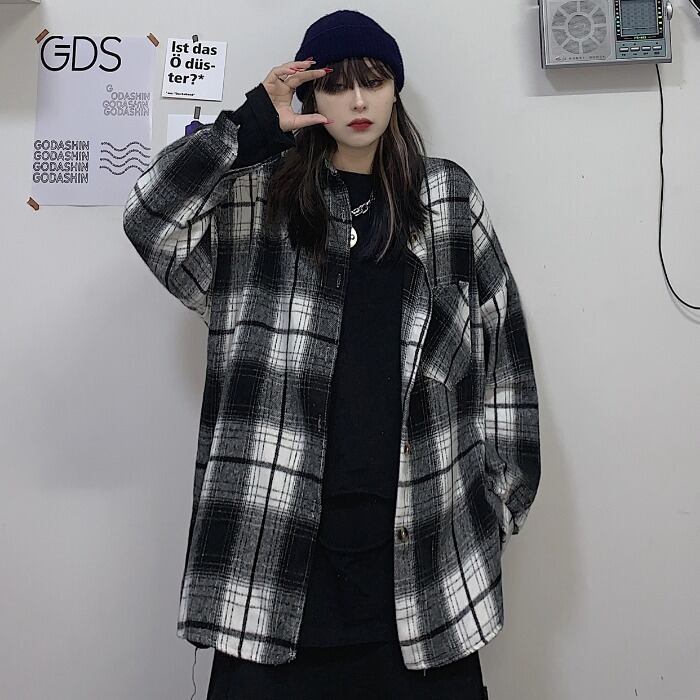 秋物ウィンター韓国ファッションNEWスタンダード格子柄ルーズカジュアルシャツ コート ロング レトロ オータム 冬物 スタイル 長袖 Studios57413416356 | pLegLad Studios