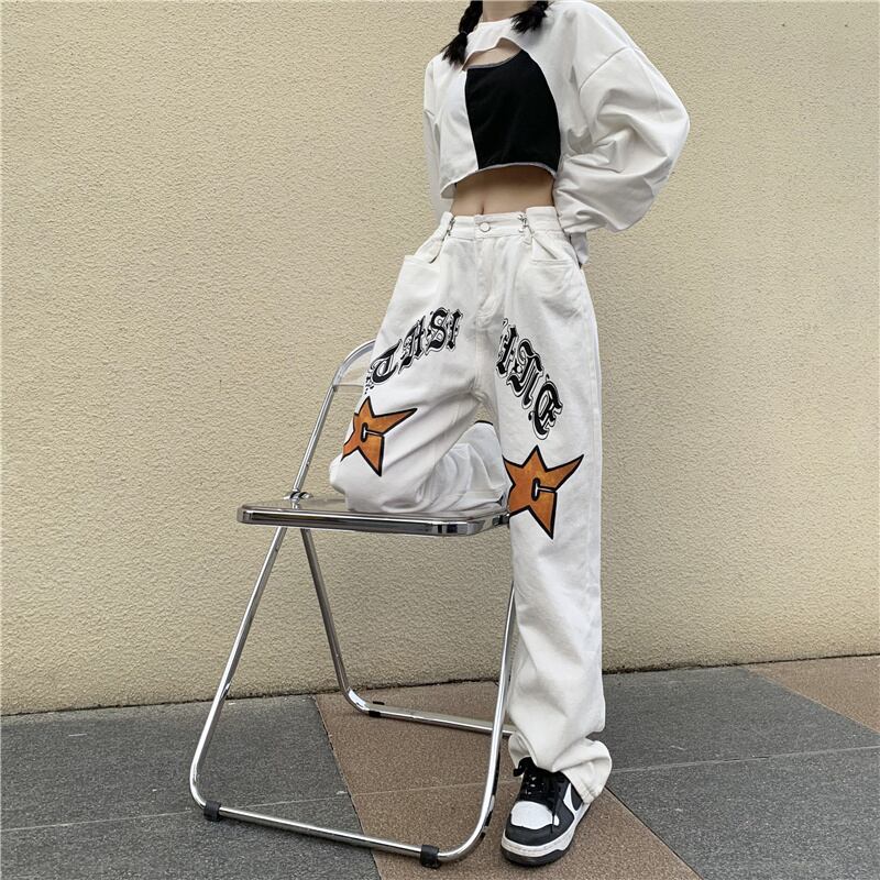 韓国ファッションNEWプリント柄ハイウェストウェストボタンルーズジーンズ レディース ストリート アジャスタブル スタイル ウエスト Studios44105147284 | pLegLad Studios