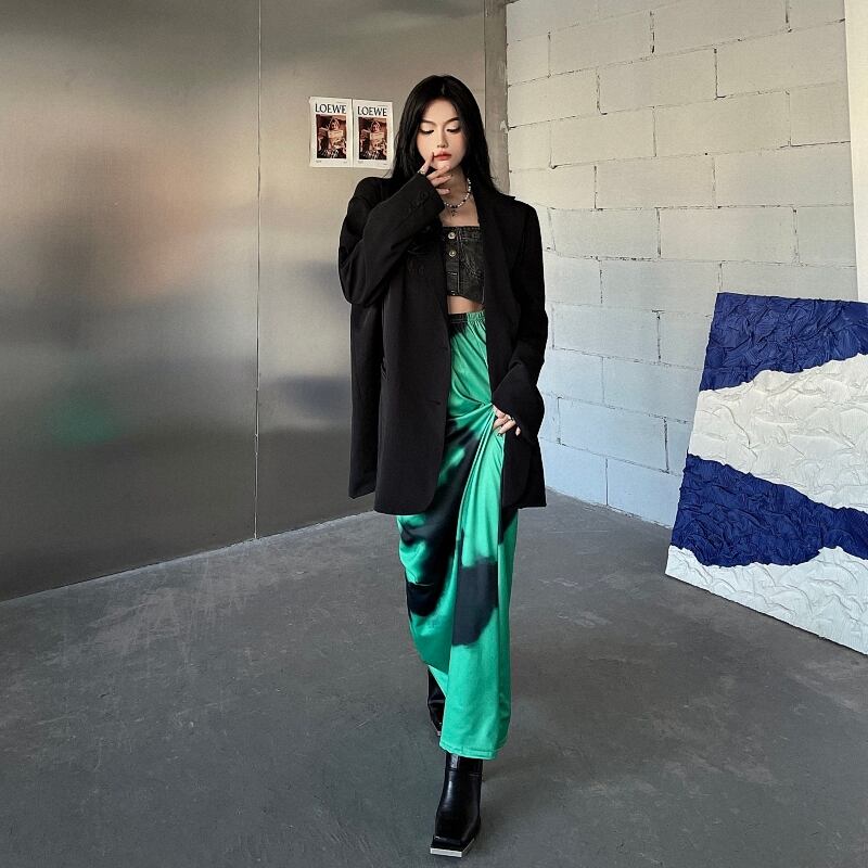 夏服韓国ファッションNEWスタイルスタンダードグリーンスカート ストレッチウェストスリットカジュアルレディース レトロ エラスティック 伸縮 夏物 ウエスト ミドル丈 Studios40788365695 | pLegLad Studios