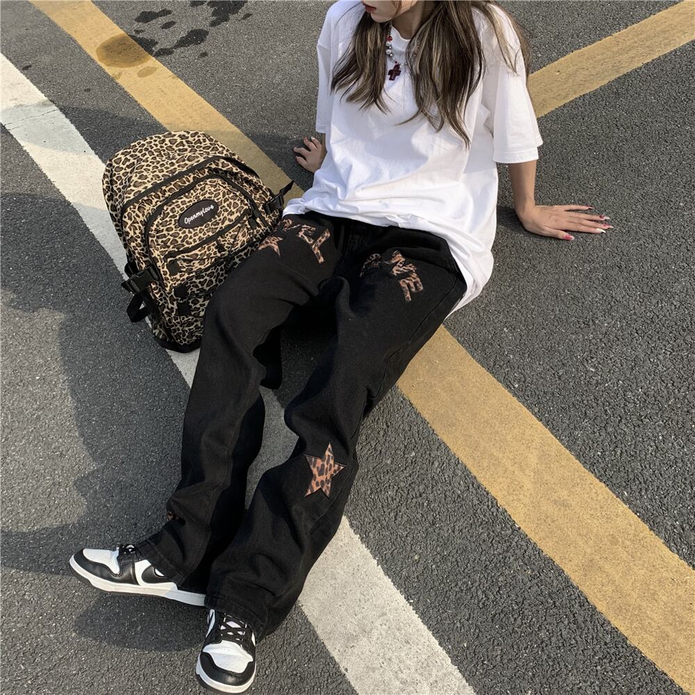 レオパードプリント柄ジーンズ 秋物ウィンタールーズ薄手ハイウェストウェストワイドレッグパンツ ストリート オータム 冬物 ワイドパンツ ウエスト Studios6209335087 | pLegLad Studios