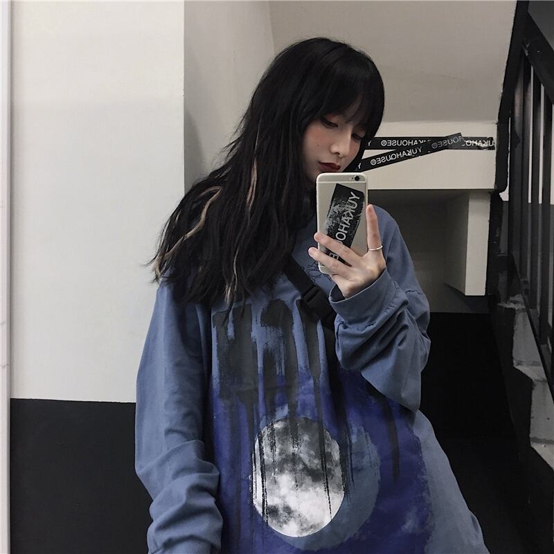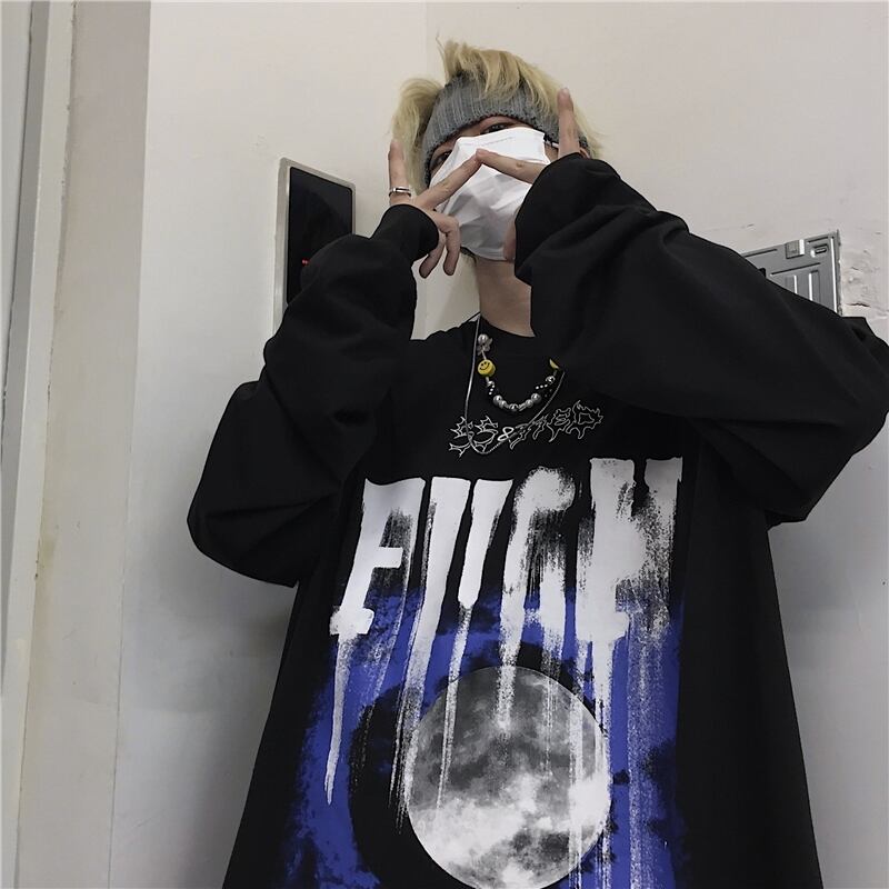 スプリング韓国ファッションNEWスタイルダークプリントルーズラウンドネックゆったりTシャツメンズレディース ロング 原宿 春物 Oネック 長袖 Studios45077827330 | pLegLad Studios