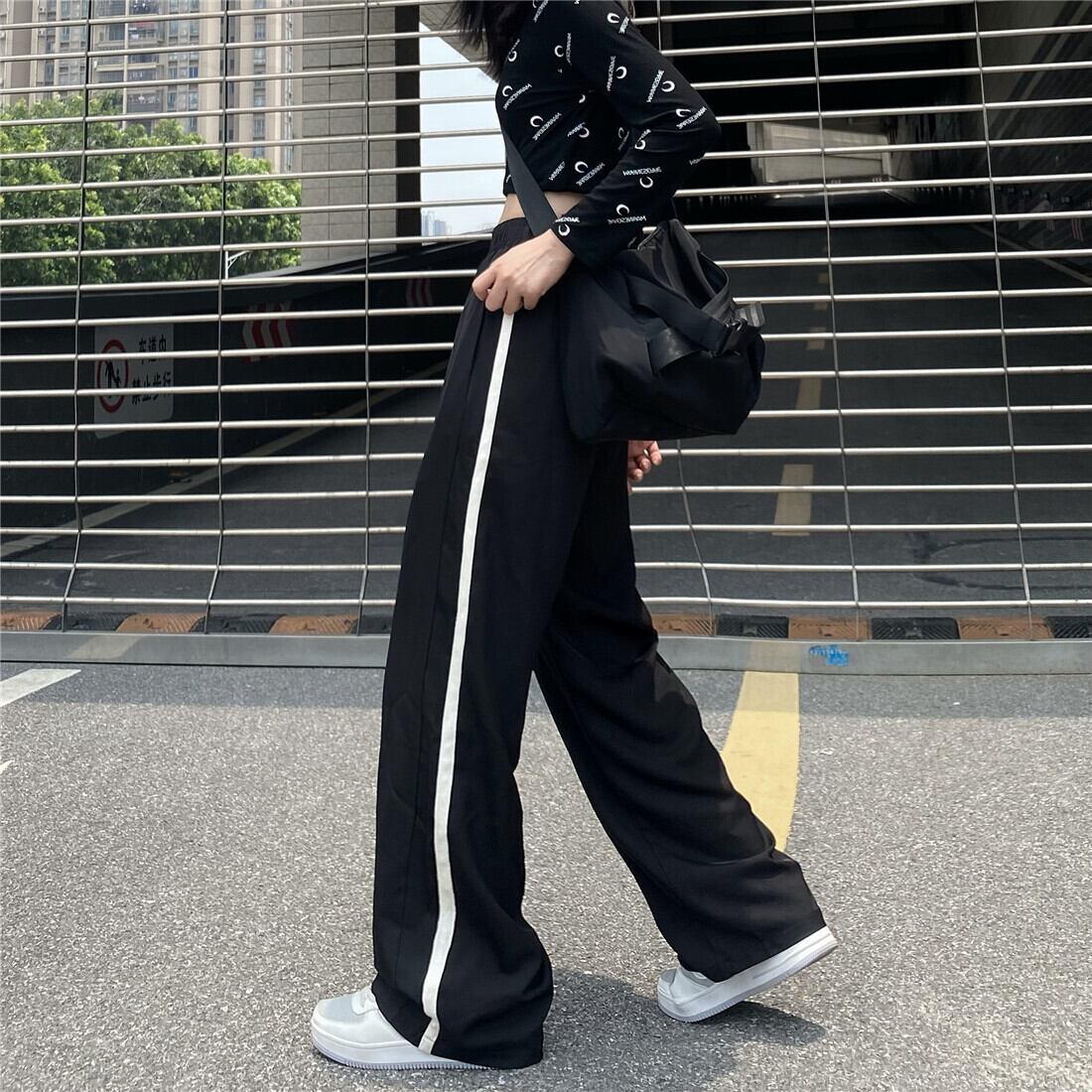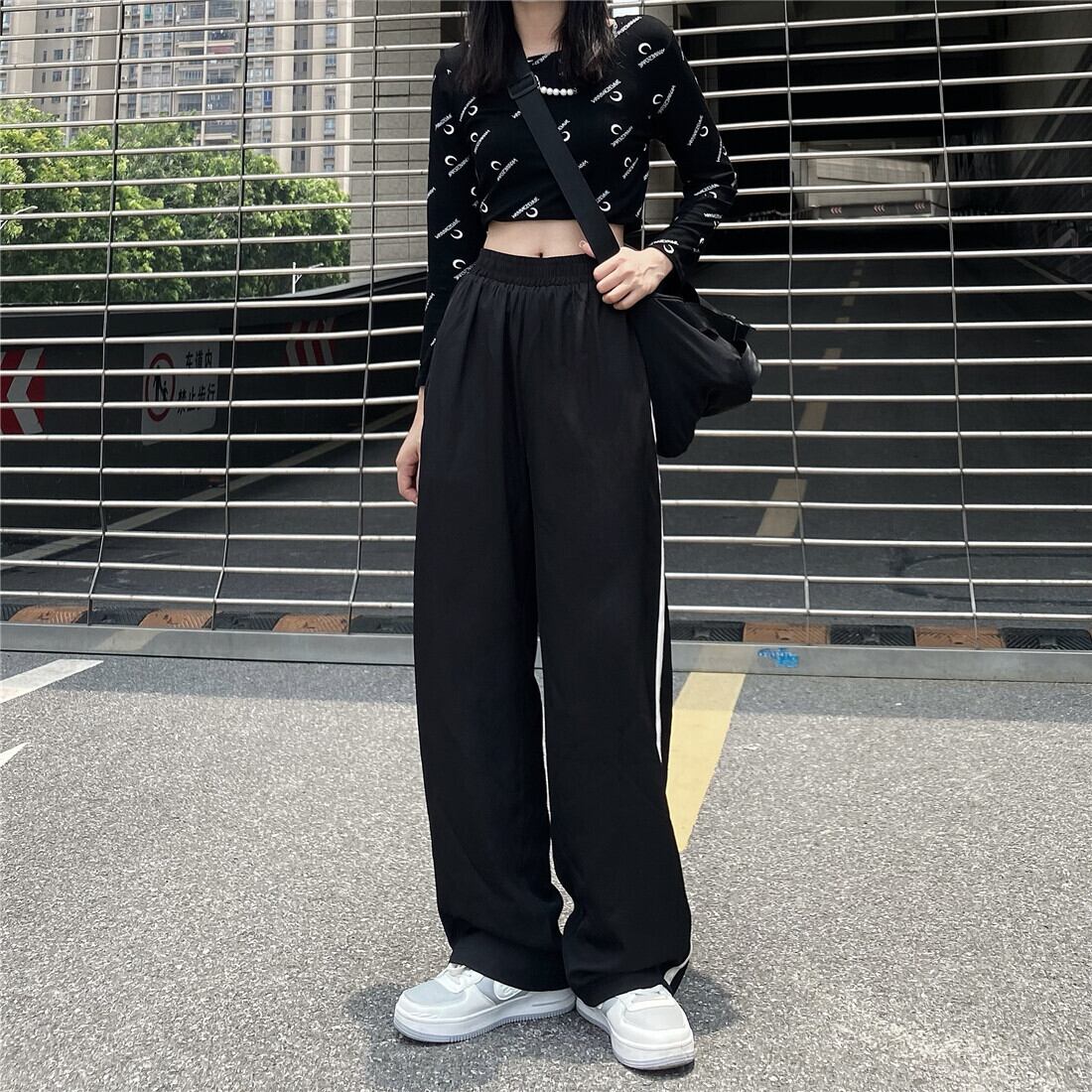 カジュアルパンツ レディース韓国ファッションNEWブラックルーズハイウェストウェスト薄手ワイドレッグ ストリート ワイドパンツ スタイル ウエスト Studios66000447698 | pLegLad Studios