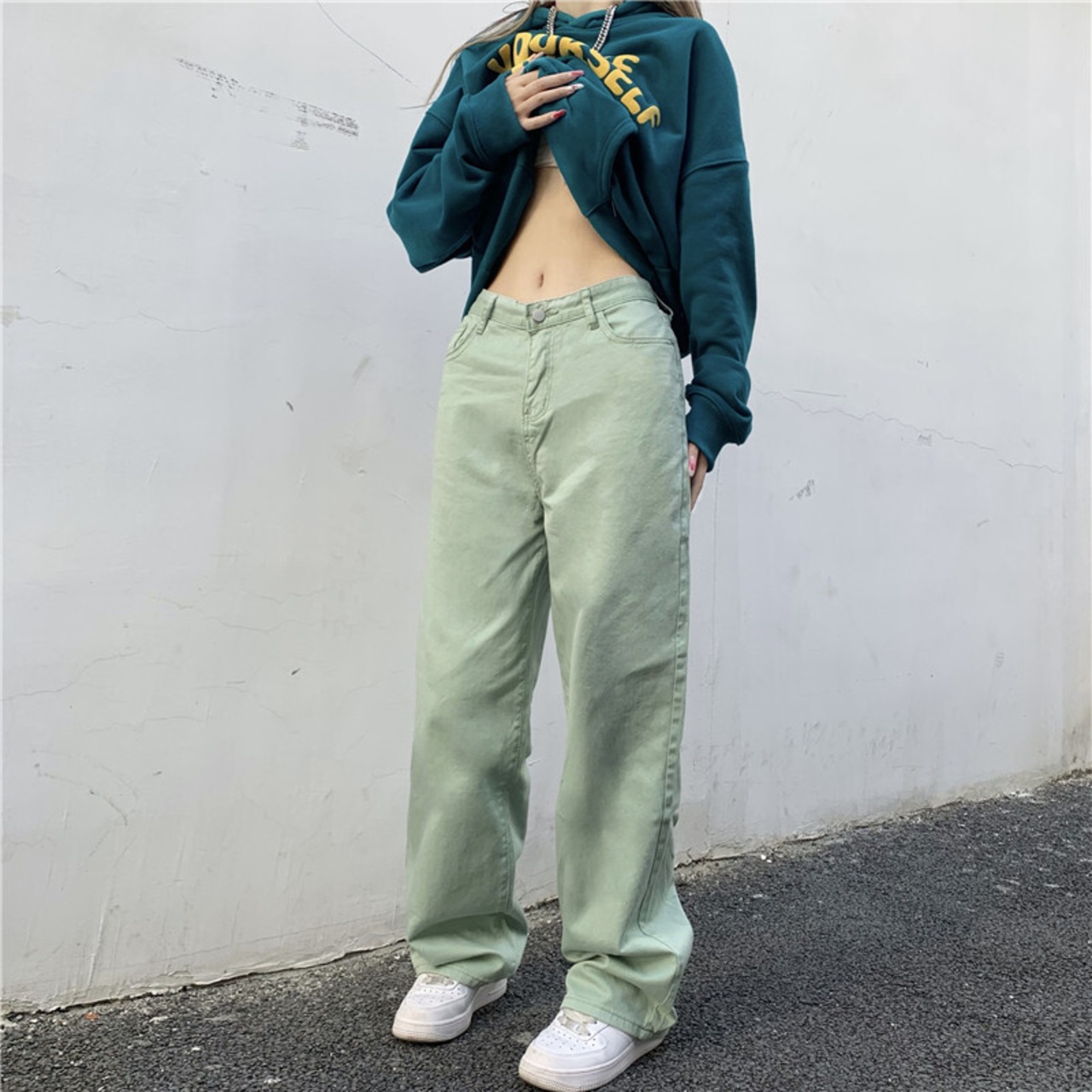 ウェストジーンズ レディース韓国ファッションNEWスタンダードグリーンルーズ薄手ワイドレッグカジュアル レトロ ワイドパンツ スタイル ウエスト Studios4705594112 | pLegLad Studios